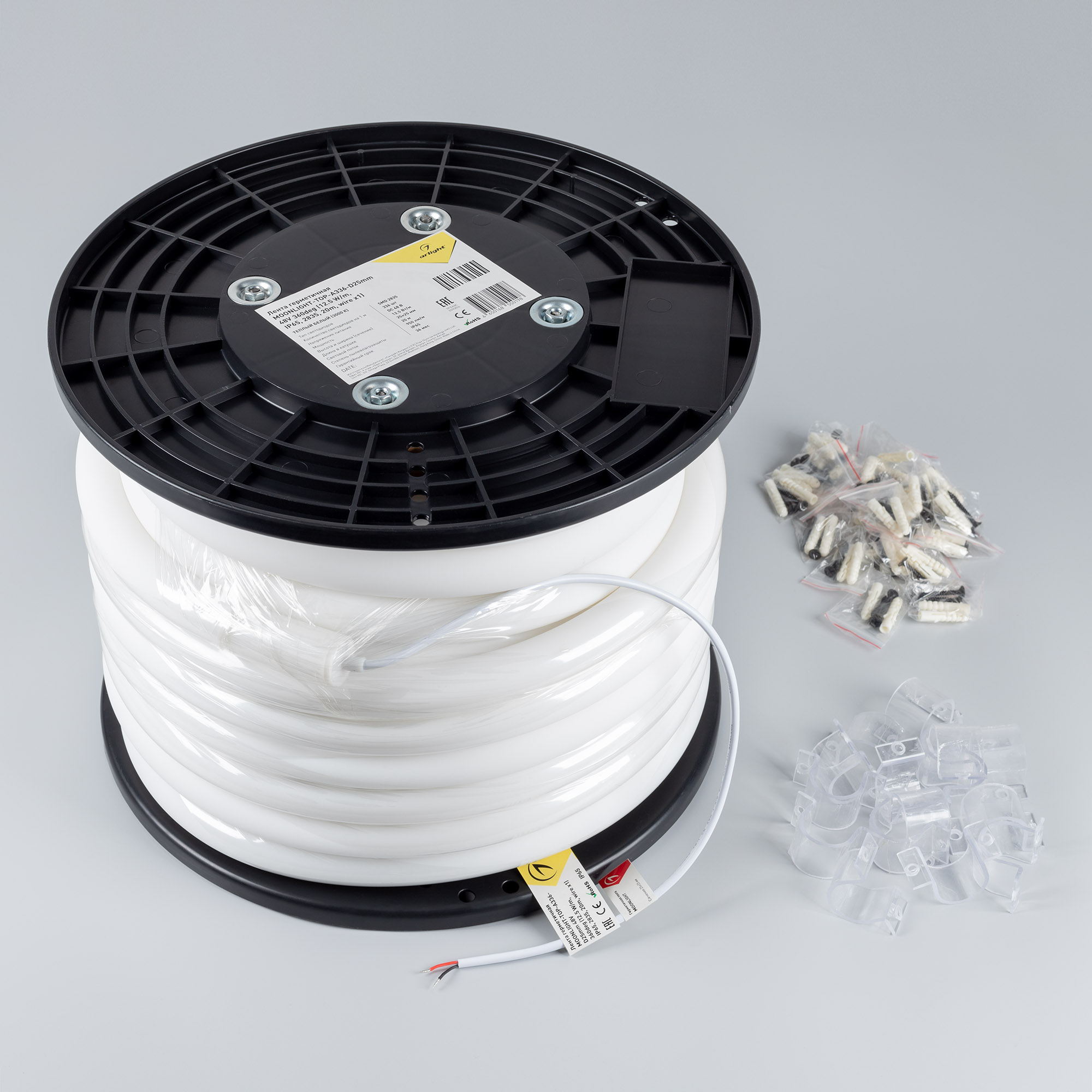 Гибкая герметичная лента MOONLIGHT имеет круглое сечение 25×25 мм и оснащена 336 светодиодами SMD2835 на метр. Теплый цвет свечения (3000К) и матовая оболочка позволяет добиться уютного освещения, а высокий индекс цветопередачи (CRI>90) позволяет создать отличную различимость цветовых оттенков. Угол излучения ленты составляет 360°, что позволит создавать с ее помощью уникальные элементы декора. Лента потребляет всего 12,5 Вт/м и работает от 48 V. Она обладает классом пылевлагозащиты IP65, что позволяет использовать ленту в т.ч. во влажных помещениях, и имеет минимальный радиус изгиба 120 мм. Габариты ленты составляют 20000×25×25 мм. Кабель питания длиной 500 мм выводится с одной стороны вдоль линии сечения ленты. Катушка содержит 20 м, в комплекте идут 32 накладных пластиковых держателя. Цена указана за 1 м ленты. Гарантия на ленту 3 года. Список совместимых аксессуаров, с помощью которых можно создавать уникальные декоративные композиции, можно увидеть в разделе "Совместимые".