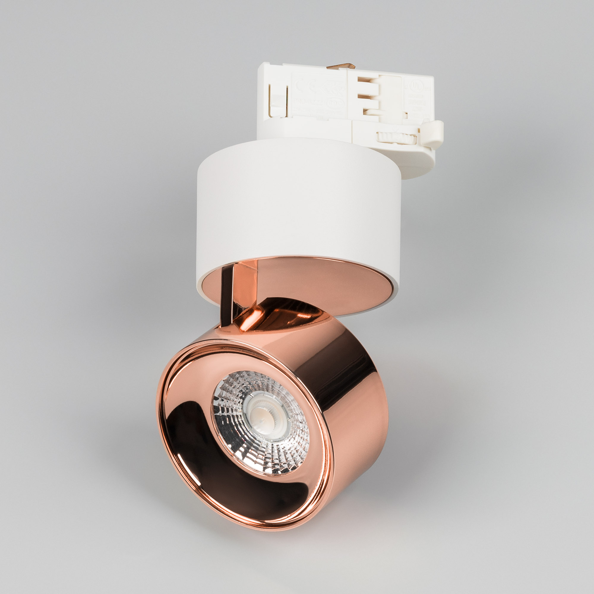 Светильник для треков/шин 4 провода. Мощность 9 Вт, св. поток 500 лм, 55 лм/Вт, теплый 3000 K, CRI>90, угол 36°, напряжение питания 230 В. Модуль цвета медь, белый круглый корпус из алюминия, степень защиты IP20. Размеры корпуса: длина адаптера 86 мм, ширина 32 мм, высота 38,2 мм., высота основания 46 мм. Размер светодиодного модуля: диаметр 77 мм, высота 59 мм. Монтаж на трек 3-фазный. Драйвер 38 В, 200 мА, пульсация <1%.