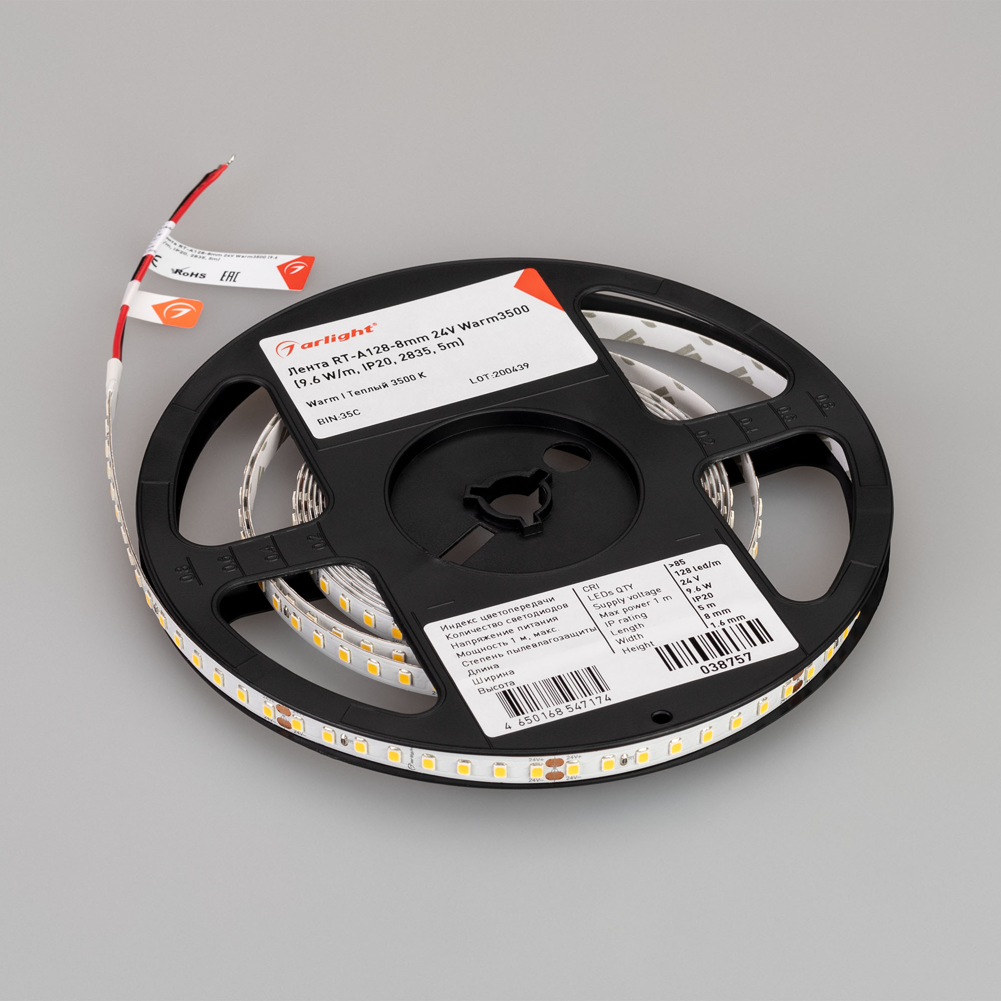 Светодиодная лента RT-A128-8mm 24V Warm3500 (9.6 W/m, IP20, 2835, 5m) (Arlight, высок.эфф.150 лм/Вт)