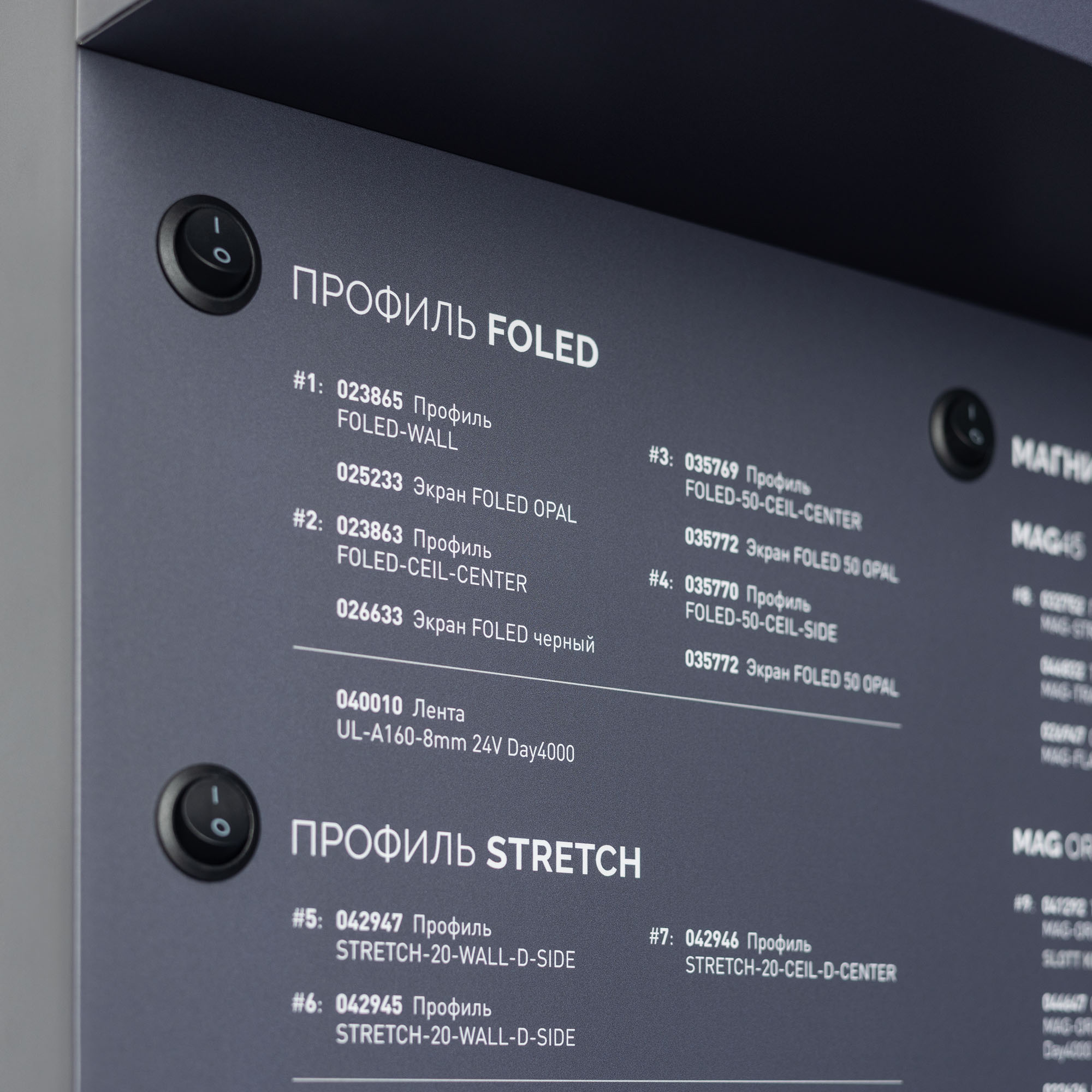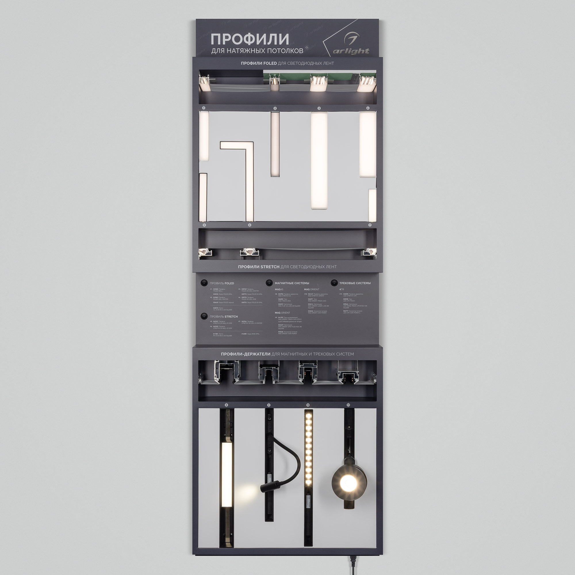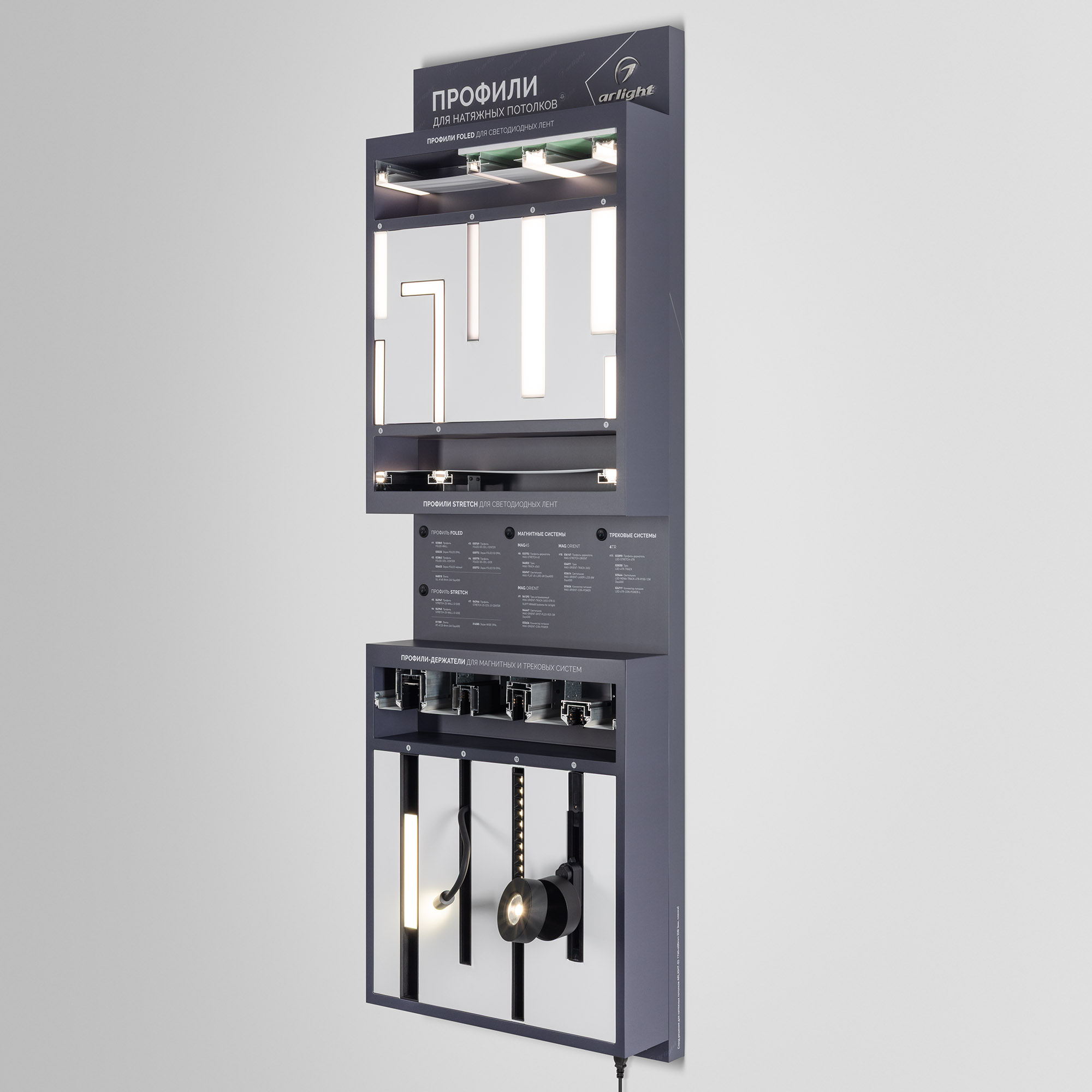 На стенде представлен ассортимент профилей Arlight для натяжных потолков: Профиль серии FOLED, совмещающий в своей конструкции каркас для крепления натяжного потолка и профиль для установки светодиодной ленты. Профиль-держатель MAG STRETCH для установки магнитных треков в натяжной потолок. Материал корпуса стенда - алюкобонд 3 мм, пленка, печать.