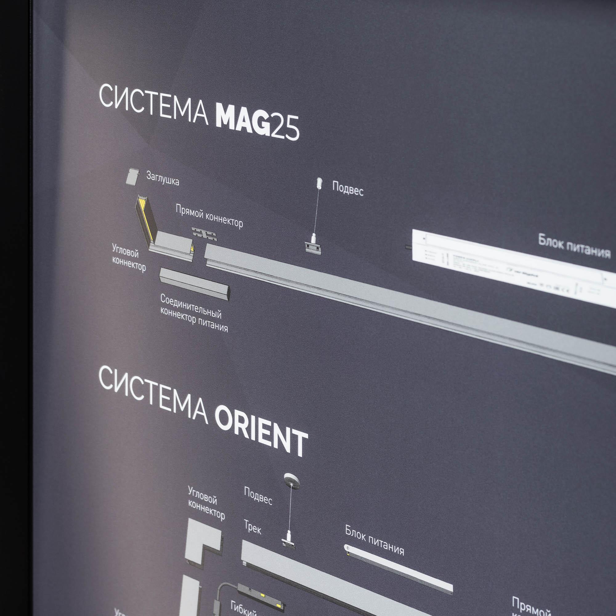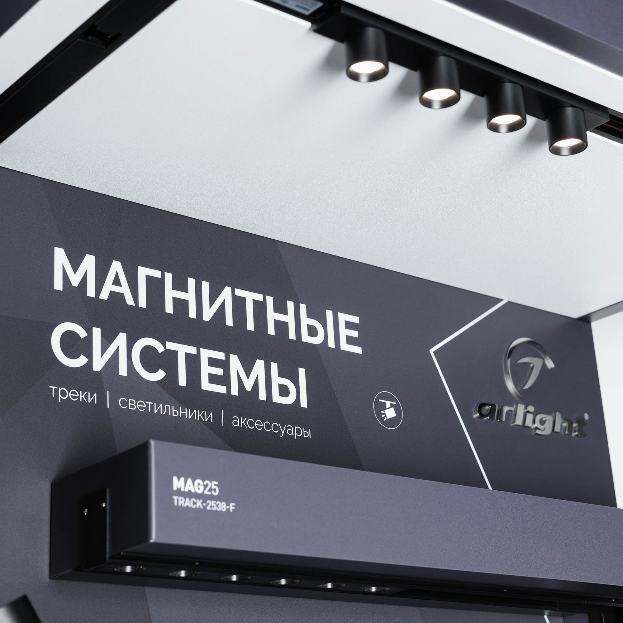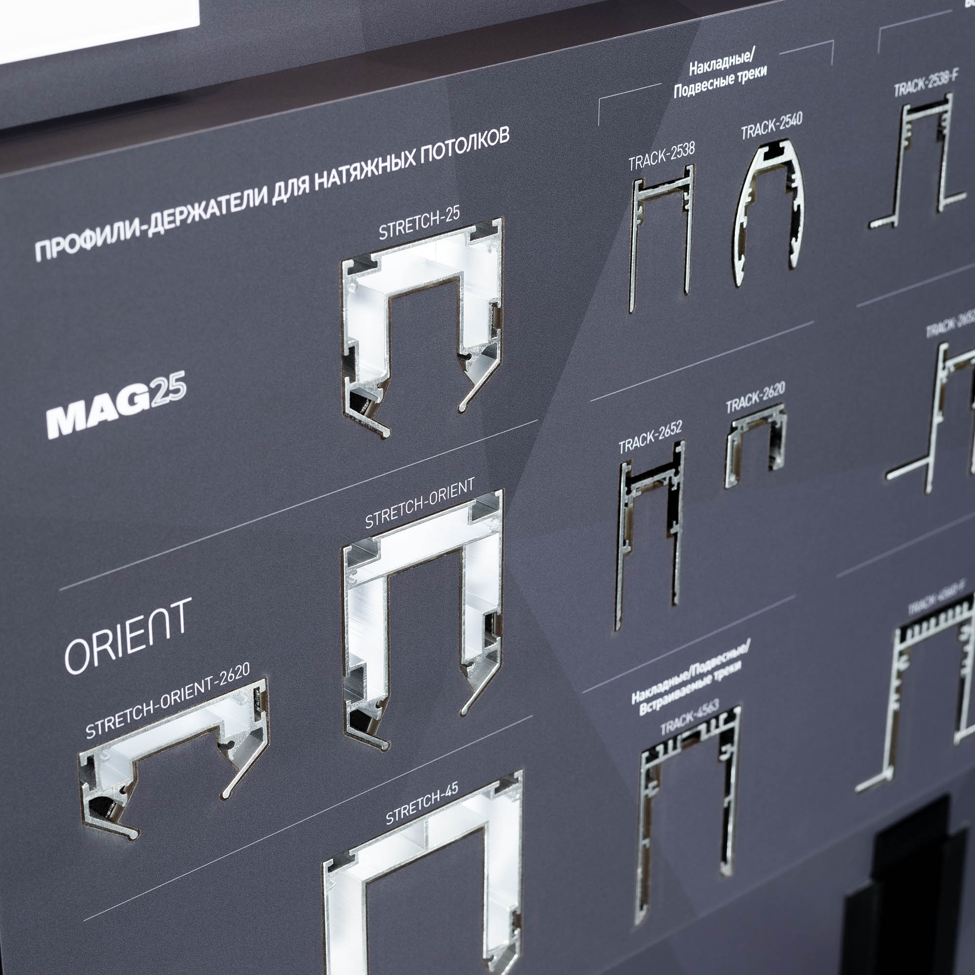 На стенде представлены магнитные системы МAG 25, MAG 45 и MAG ORIENT. Отображена полная линейка треков для данных систем: подвесные, накладные и встраиваемые модели. Показана возможность встройки магнитных систем в натяжной потолок с помощью профиля-держателя. Реализовано управление магнитной системой MAG ORIENT по протоколу DALI. Приведены схемы сборки систем с использованием дополнительных аксессуаров.