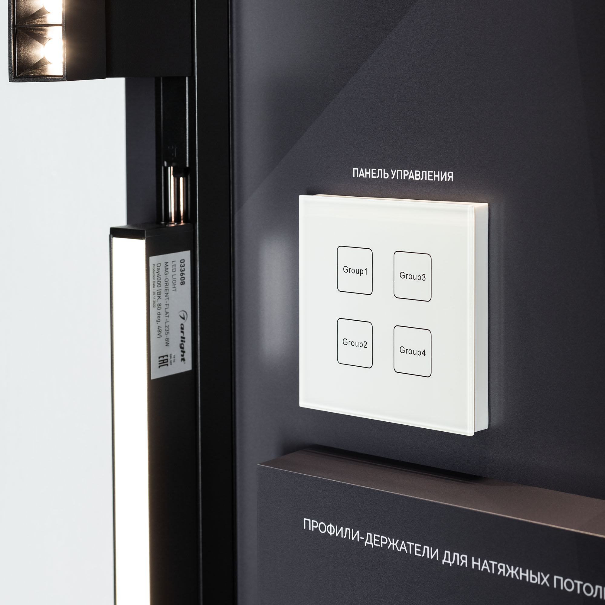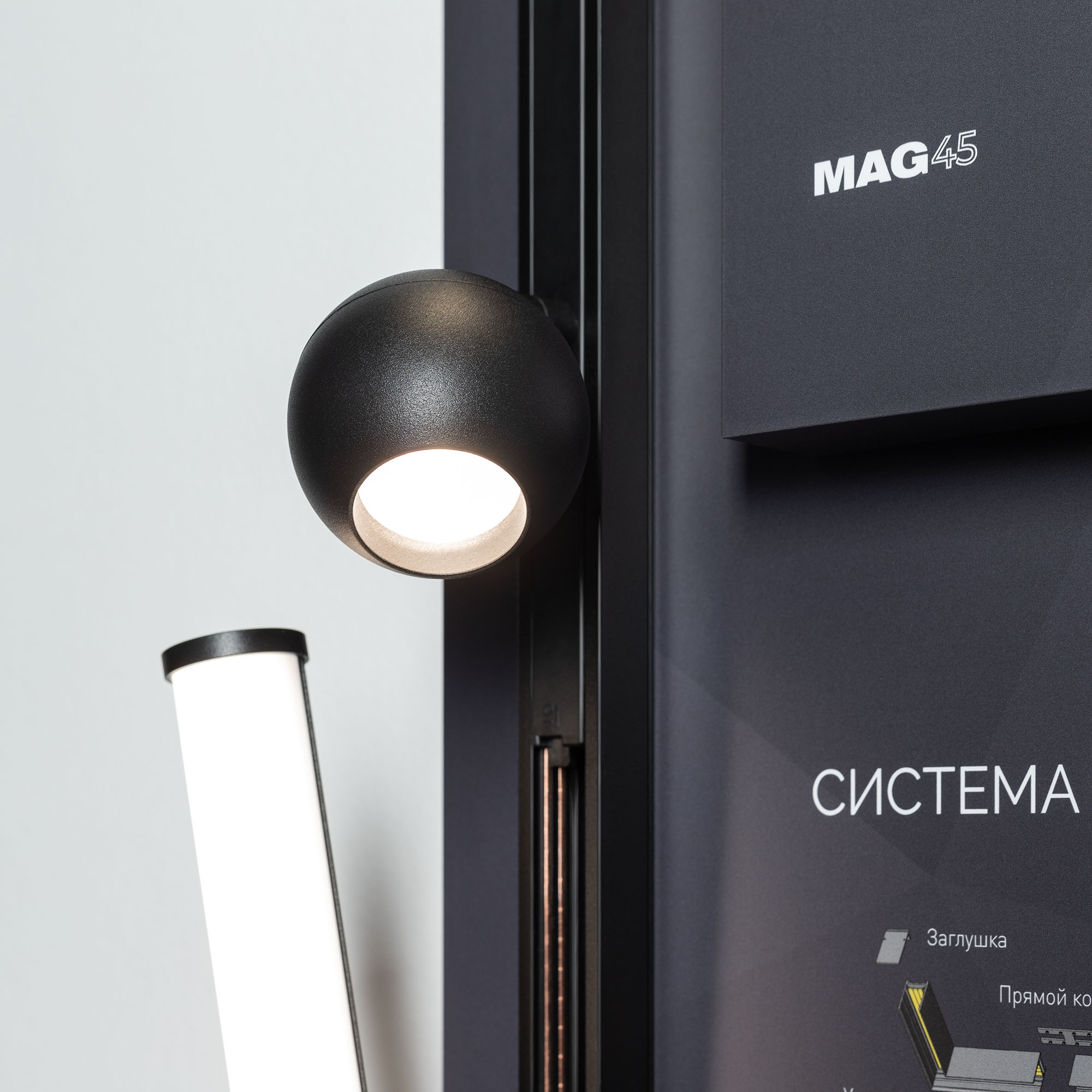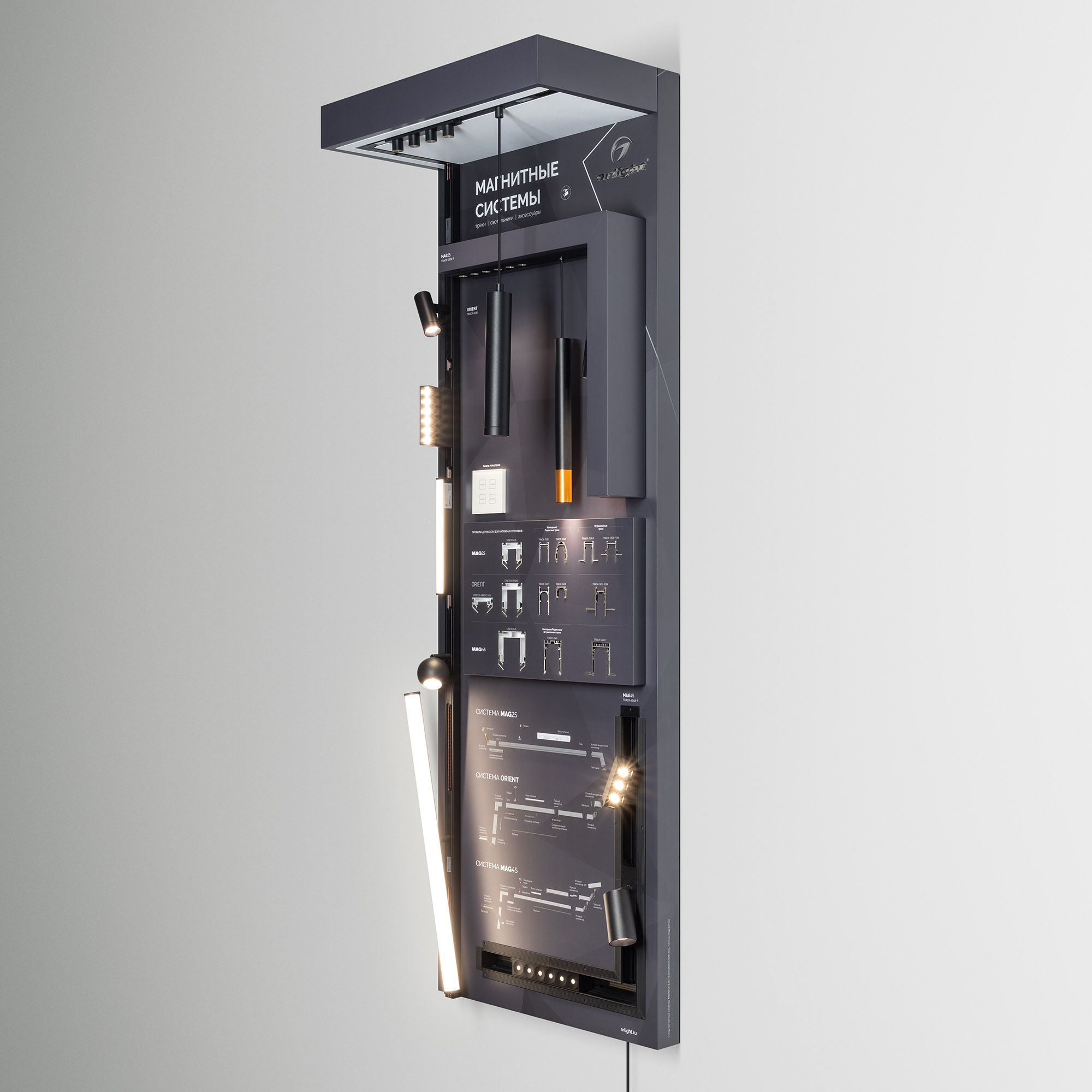 На стенде представлены магнитные системы МAG 25, MAG 45 и MAG ORIENT. Отображена полная линейка треков для данных систем: подвесные, накладные и встраиваемые модели. Показана возможность встройки магнитных систем в натяжной потолок с помощью профиля-держателя. Реализовано управление магнитной системой MAG ORIENT по протоколу DALI. Приведены схемы сборки систем с использованием дополнительных аксессуаров.