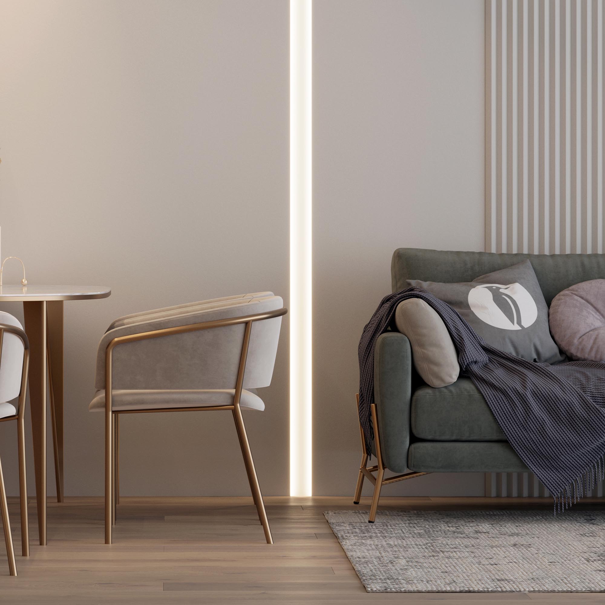 Встраиваемый алюминиевый профиль со скрытым фланцем под строительную отделку белого цвета с двусторонним свечением с эффектом «объемного света» для основного освещения и контурной подсветки.