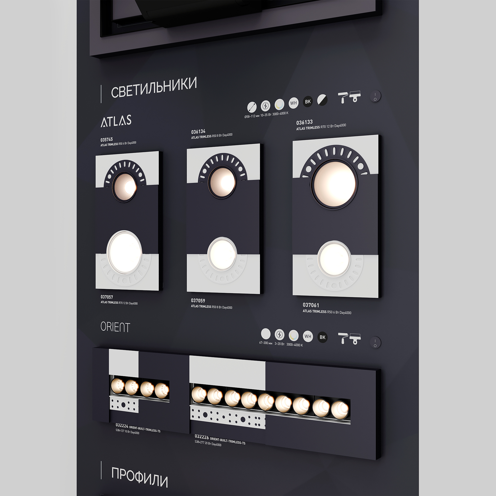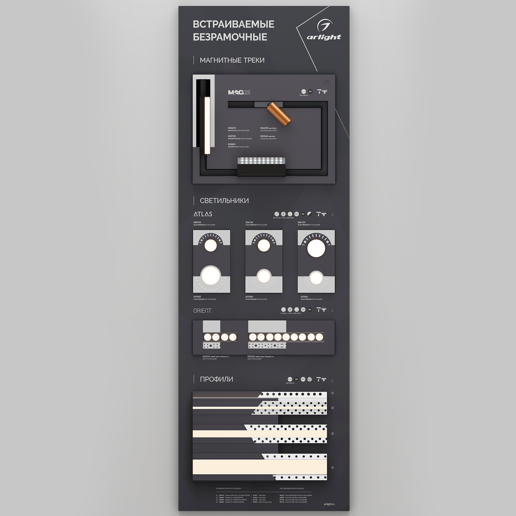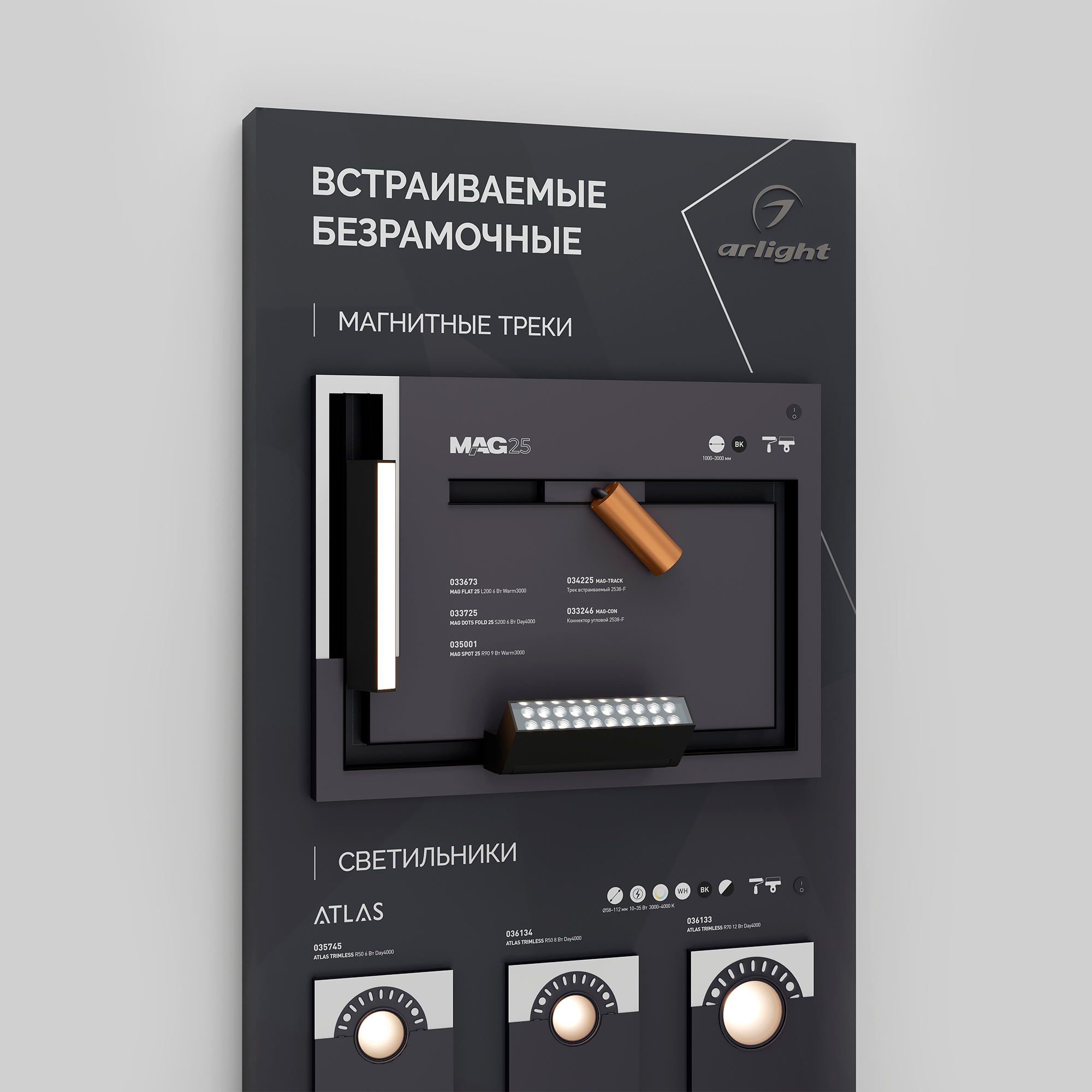 Стенд Безрамочное освещение. Включает в себя магнитные треки, светильники ATLAS, ORIENT, профили для установки под шпаклевку. Габаритные размеры (Ширина Х Высота Х Глубина), 1760х600х60мм. Питание 230 В. Материал корпуса стенда - алюкобонд 3 мм, пленка, печать.