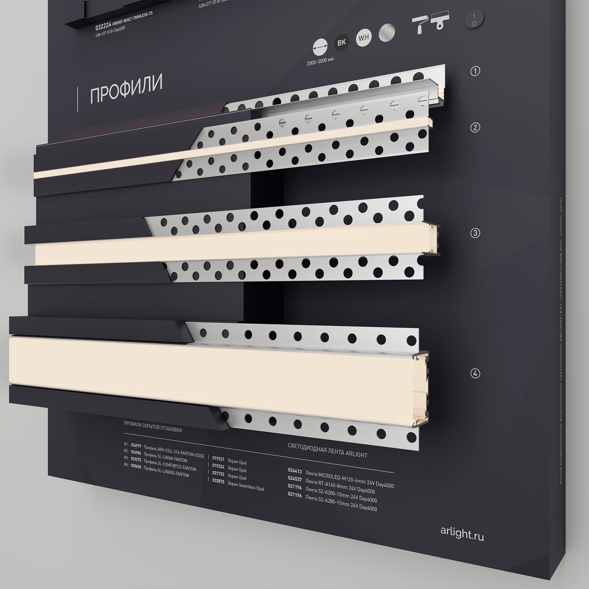 Стенд включает в себя магнитные треки, светильники ATLAS, ORIENT, профили для установки под шпаклевку.