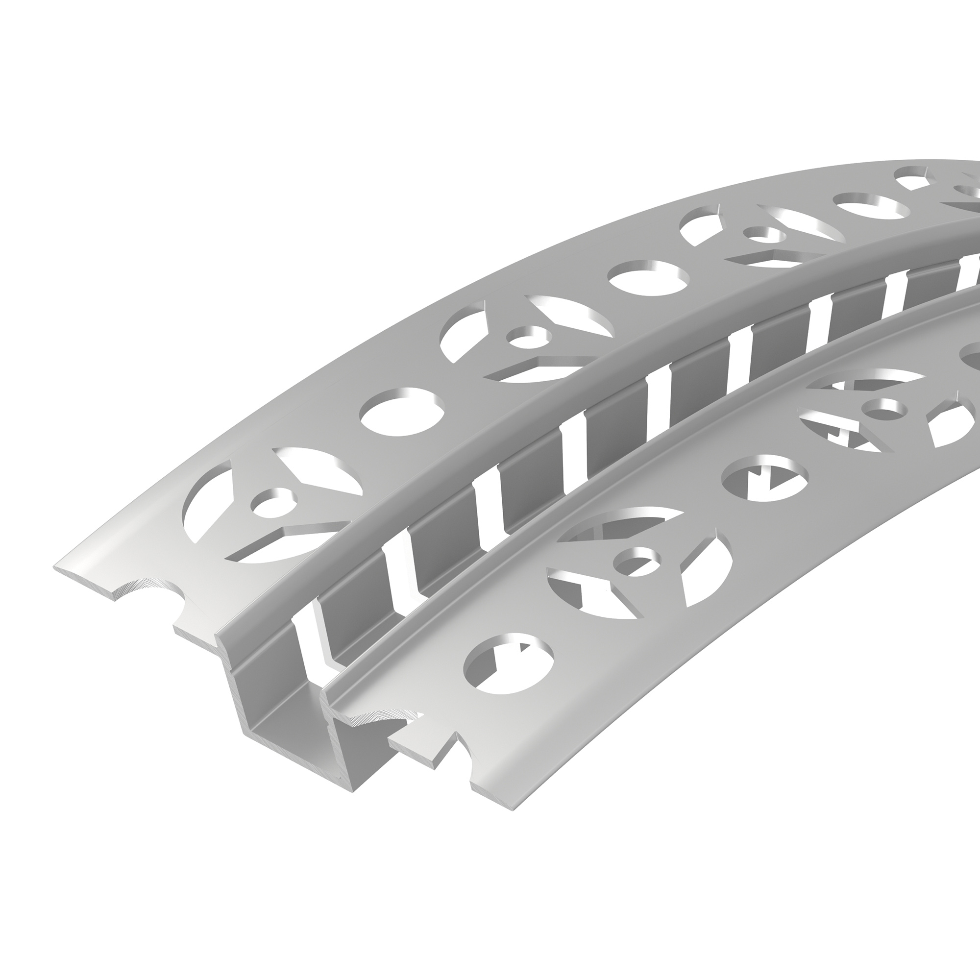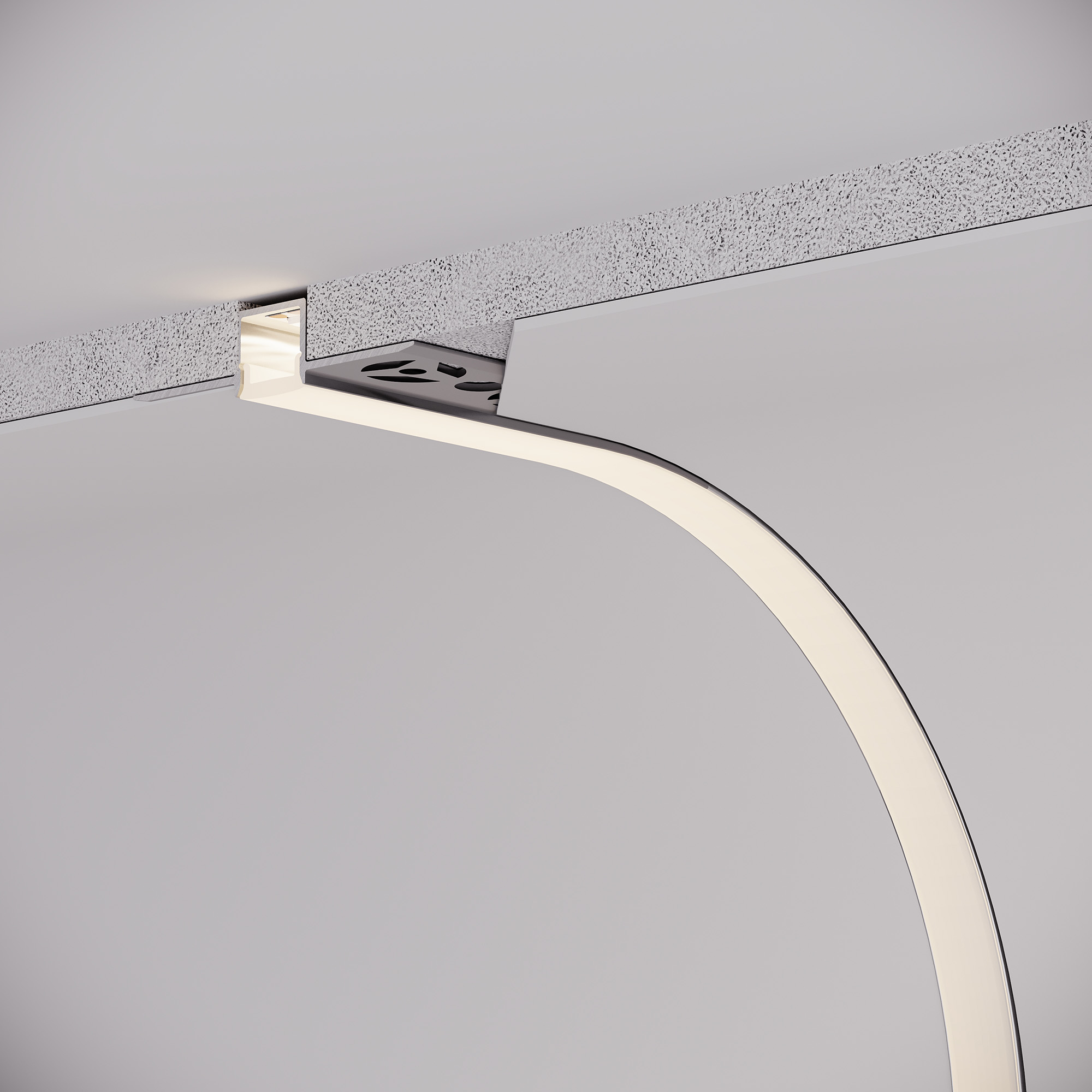 Встраиваемый гибкий профиль из анодированного алюминия со скрытым фланцем под строительную отделку устанавливается в потолки и потолочные ниши из гипсокартона. Минимальный радиус вертикального изгиба (вверх/вниз) 30 см.