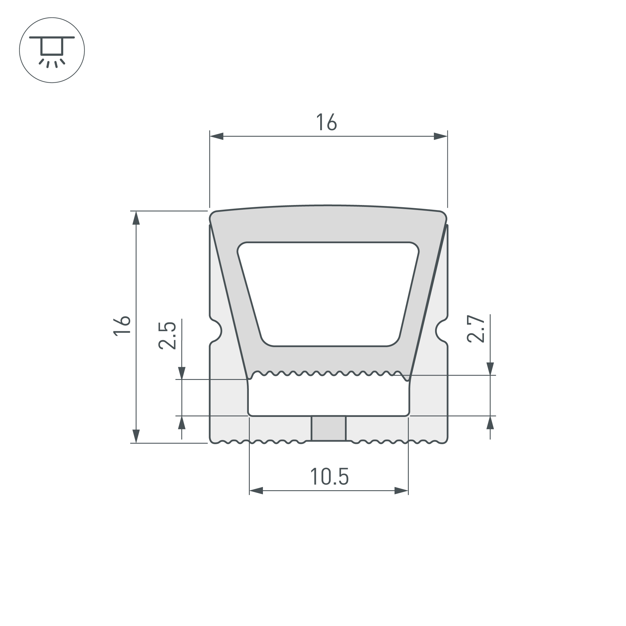 Цельнолитой силиконовый гибкий профиль, белый матовый. Габаритные размеры 20000×16×16 мм. Вертикальный изгиб TOP, минимальный радиус изгиба 60 мм. Для установки во влажных помещениях необходима герметизация при помощи двухкомпонентного эпоксидного герметика. Класс пылевлагозащиты – IP65 (при соблюдении технологии герметизации). Для лент шириной от 10 до10,5 мм, высотой до 2,85 мм и мощностью до 10 Вт/м. При подборе ленты необходимо учитывать, что втяжка лент COB, герметичных лент и лент с наличием силиконового слоя может быть затруднена. Угол излучения 115°. Поставляется в катушках по 20 м. Цена за 1 м. Подходит только для установки внутри помещения.