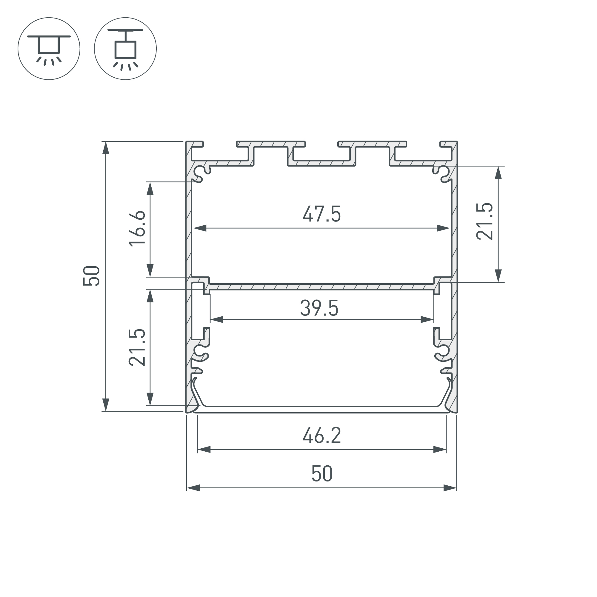 Алюминиевый профиль для светодиодных лент и линеек. Цвет - белый RAL9003 (порошковая окраска). Габаритные размеры (L×W×H): 2000x50x50 мм. Ширина площадки для ленты 39,5 мм. Отсек для БП 39,5х21,5 мм. Экраны, заглушки и другие аксессуары приобретаются отдельно. Цена за 1 метр.