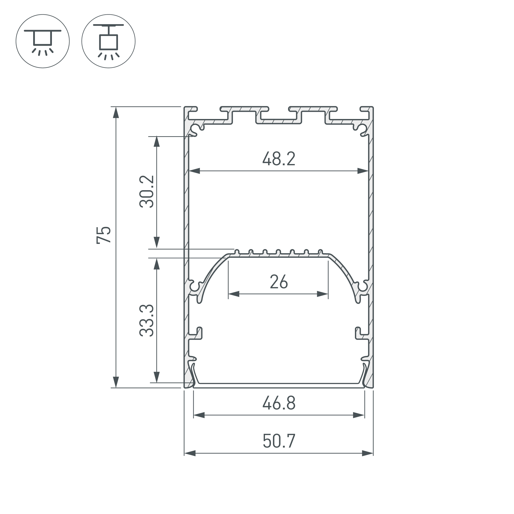 Подвесной/накладной профиль из анодированного алюминия с отсеком для блока питания (48,2х30,2 мм) для основного освещения и контурной подсветки. Габаритные размеры профиля составляют 3000 мм в длину, 50,7 мм в ширину и 75 мм в высоту. Площадка для установки светодиодных лент позволяет использовать ленту шириной до 26 мм и мощностью до 65 Вт/м. Это обеспечивает гибкость в выборе светодиодных лент и создает потрясающие световые решения. Экраны, заглушки и другие аксессуары не включены в комплект и приобретаются отдельно. Цена указана за 1 метр профиля. Отличное решение для создания современных световых проектов. При изготовлении светильников длиной, превышающей длину профиля, соединители необходимо крепить к стенками профиля винтами с минимальным усилием, до первого ощущения сопротивления.