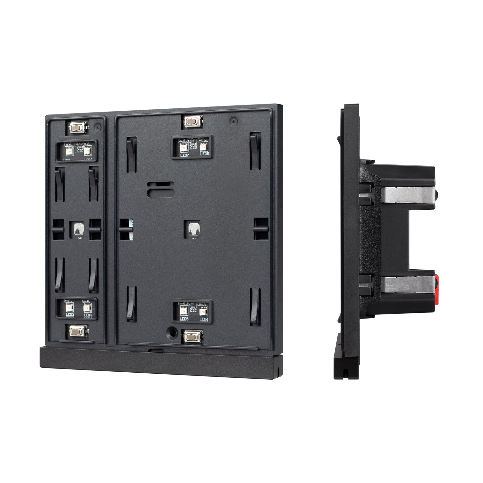Механизм встраиваемой панели черного цвета с кнопочным управлением, предназначенная для включения и выключения световых сцен в системах управления светом KNX. Позволяет осуществлять включение/выключение, диммирование, управление шторами и жалюзи, управлять сценами. Поддерживает управление с помощью 2 настраиваемых рокерных клавиш. Каждая клавиша может выполнять функции 2-х клавиш. Устройство совместимо с исполнительными устройствами стандарта KNX, в том числе, мировых производителей ABB, SCHNEIDER ELECTRIC, SIEMENS, ZENNIO и другими. Удобное и точное управление при помощи отдельных механических кнопок для каждой функции. Питание от шины KNX. Габариты устройства составляют 86x86x33 мм, установка в стандартную монтажную коробку. Пластиковый корпус, цвет черый, безрамочный корпус, материал - пластик, светодиодная индикация.