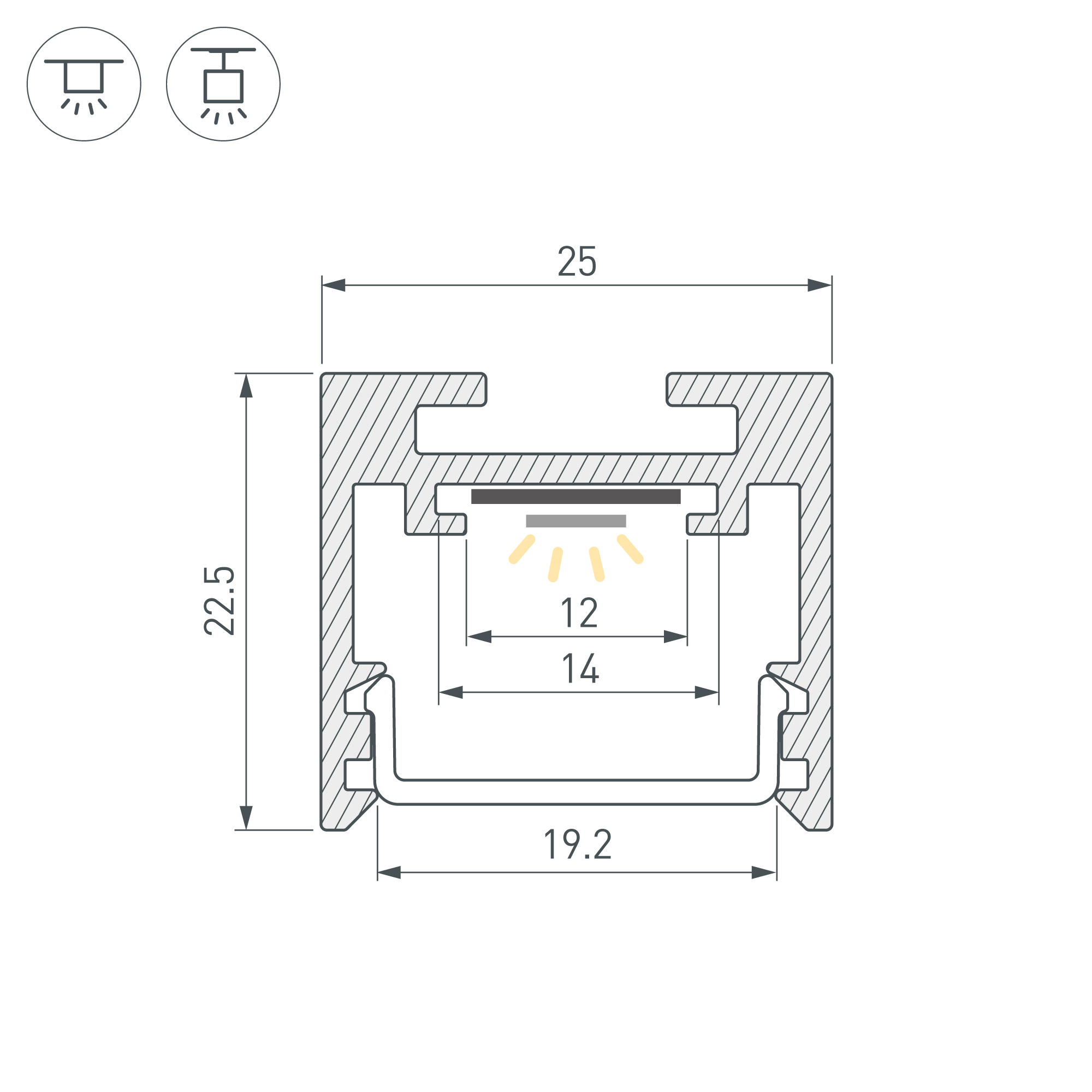 Подвесной/накладной профиль белого цвета из алюминия для основного освещения и контурной подсветки. Габаритные размеры профиля составляют 2500 мм в длину, 25 мм в ширину и 22 мм в высоту. Площадки для установки светодиодных лент позволяют использовать ленты шириной до 12 мм и мощностью до 25 Вт/м. Это обеспечивает гибкость в выборе светодиодных лент и создает потрясающие световые решения. Экраны, заглушки и другие аксессуары не включены в комплект и приобретаются отдельно. Цена указана за 1 метр профиля. Отличное решение для создания современных световых проектов.