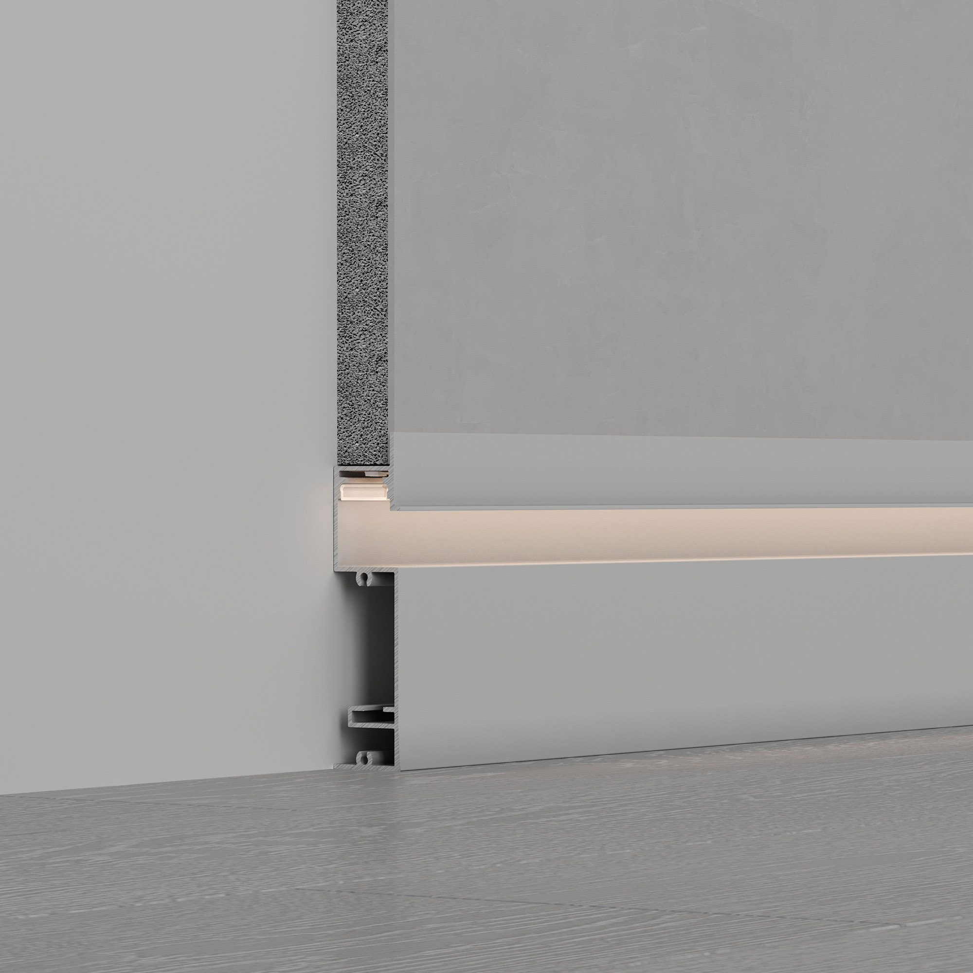 Встраиваемый алюминиевый профиль-плинтус с накладным фланцем белого цвета для создания эффекта парящей стены.