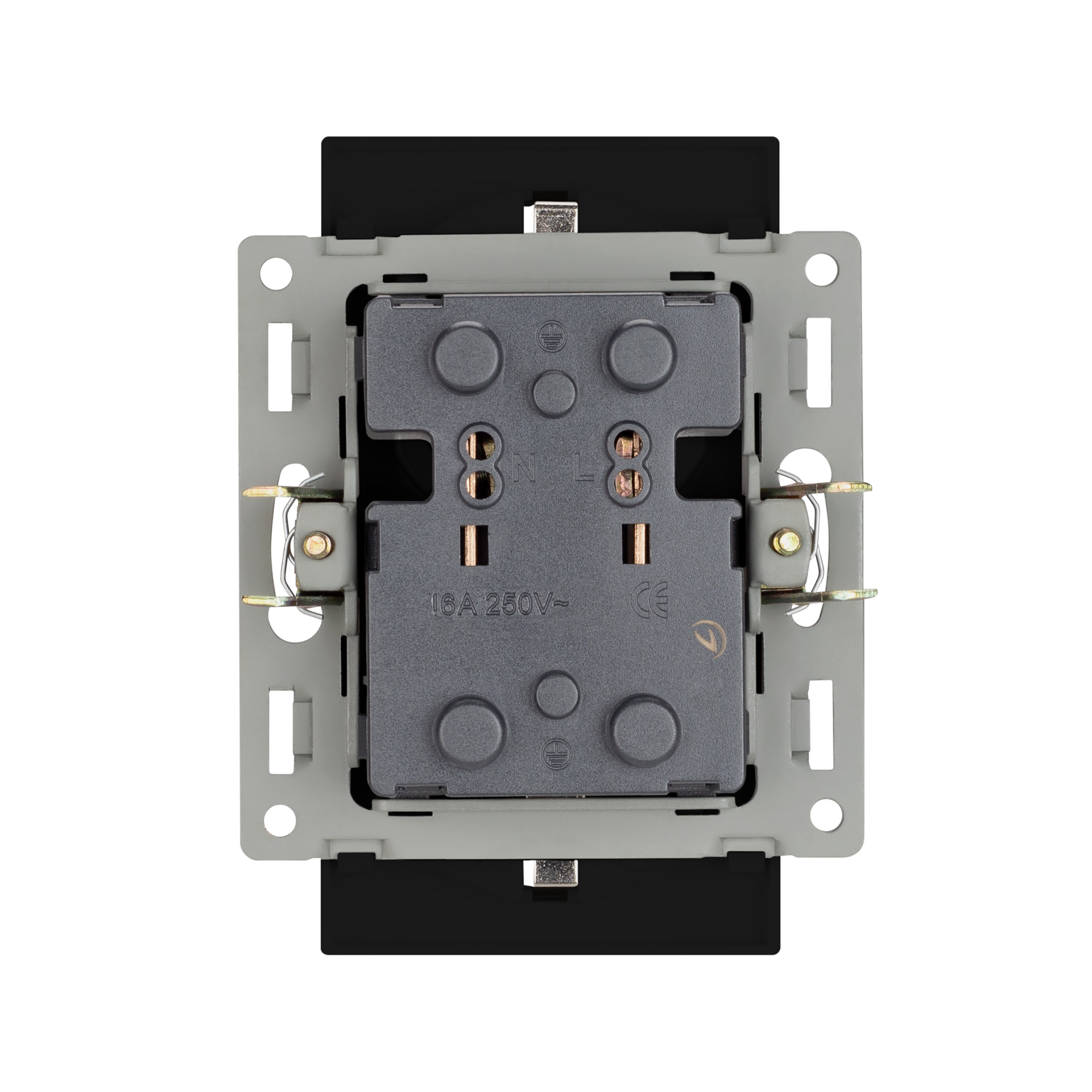 Механизм розетки вертикальный, с заземлением на 2 поста и с суппортом из алюминия. Цвет - черный. Степень пылевлагозащиты - IP20.