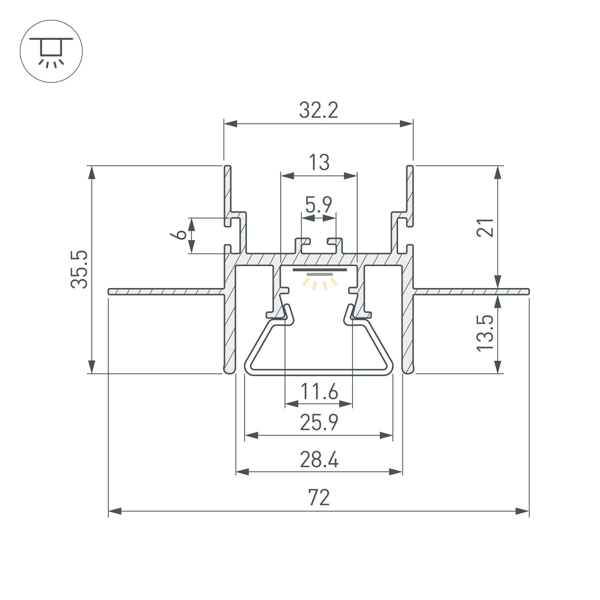Габаритные размеры профиля составляют 2000 мм в длину, 72 мм в ширину и 35,5 мм в высоту. Площадка для установки светодиодных лент позволяет использовать ленту шириной до 13 мм и мощностью до 40 Вт/м. Это обеспечивает гибкость в выборе светодиодных лент и создает потрясающие световые решения.