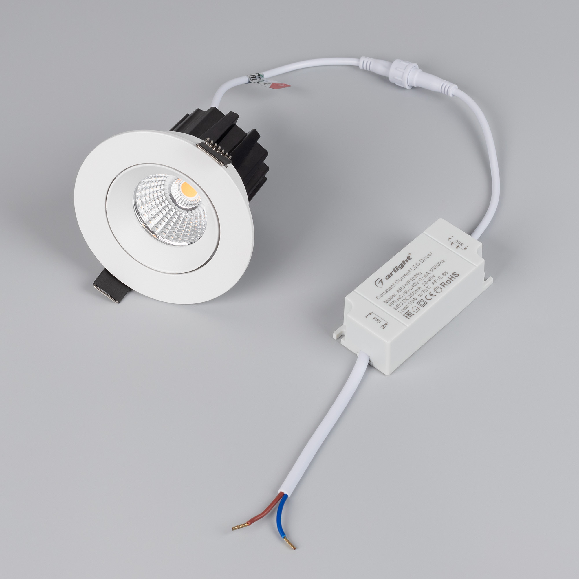 Встраиваемый поворотный светильник даунлайт. Мощность 10 Вт, св. поток 750 лм, 75 лм/Вт, теплый 3000 K, CRI>90, угол 60°, напряжение питания 230 В. Белый круглый корпус из алюминия, экран PMMA, степень защиты IP54. Размер: диаметр 94 мм, высота 75 мм. Монтаж встраиваемый, установочное отверстие: диаметр 75 мм. Драйвер IP54, 20-40 В, 250 мА, пульсация <1%.