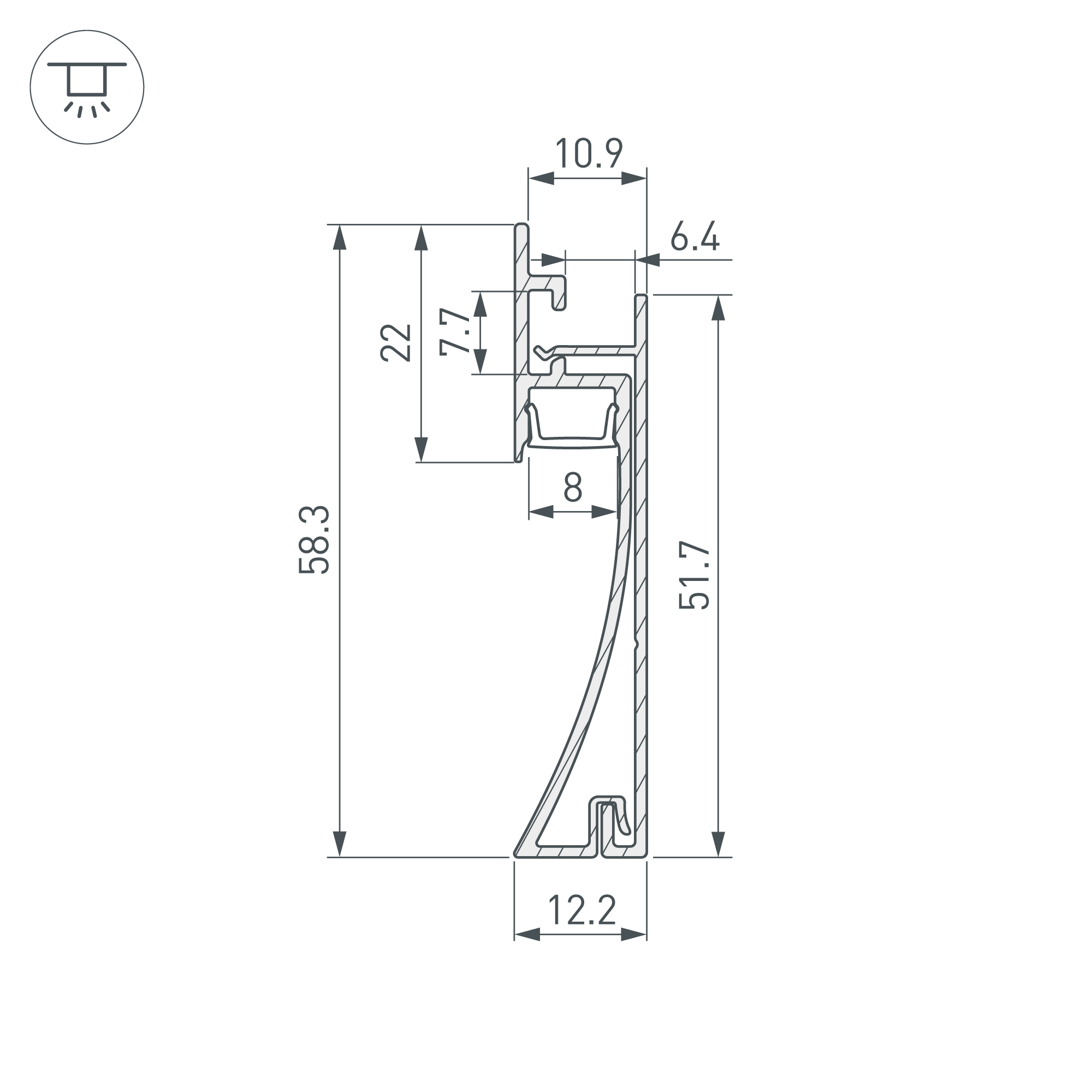 Габаритные размеры профиля составляют 2000 мм в длину, 12,2 мм в ширину и 58,3 мм в высоту. Площадка для установки светодиодных лент позволяет использовать ленту шириной до 8 мм и мощностью до 20 Вт/м. Это обеспечивает гибкость в выборе светодиодных лент и создает потрясающие световые решения.