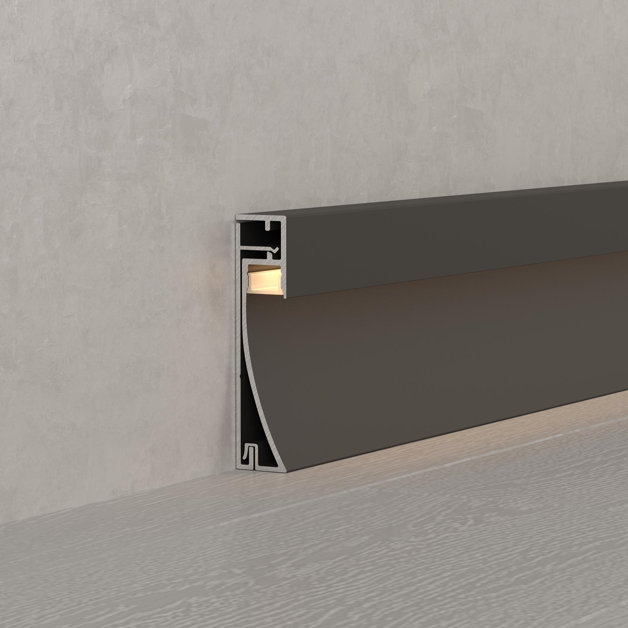 Алюминиевый накладной двухкомпонентный профиль-плинтус для светодиодных лент и линеек. Цвет - черный RAL9005 (порошковая окраска). Габаритные размеры (L×W×H): 2000x12,2x53,3мм. Ширина площадки для ленты 8 мм. Аксессуары приобретаются отдельно. Цена за метр.