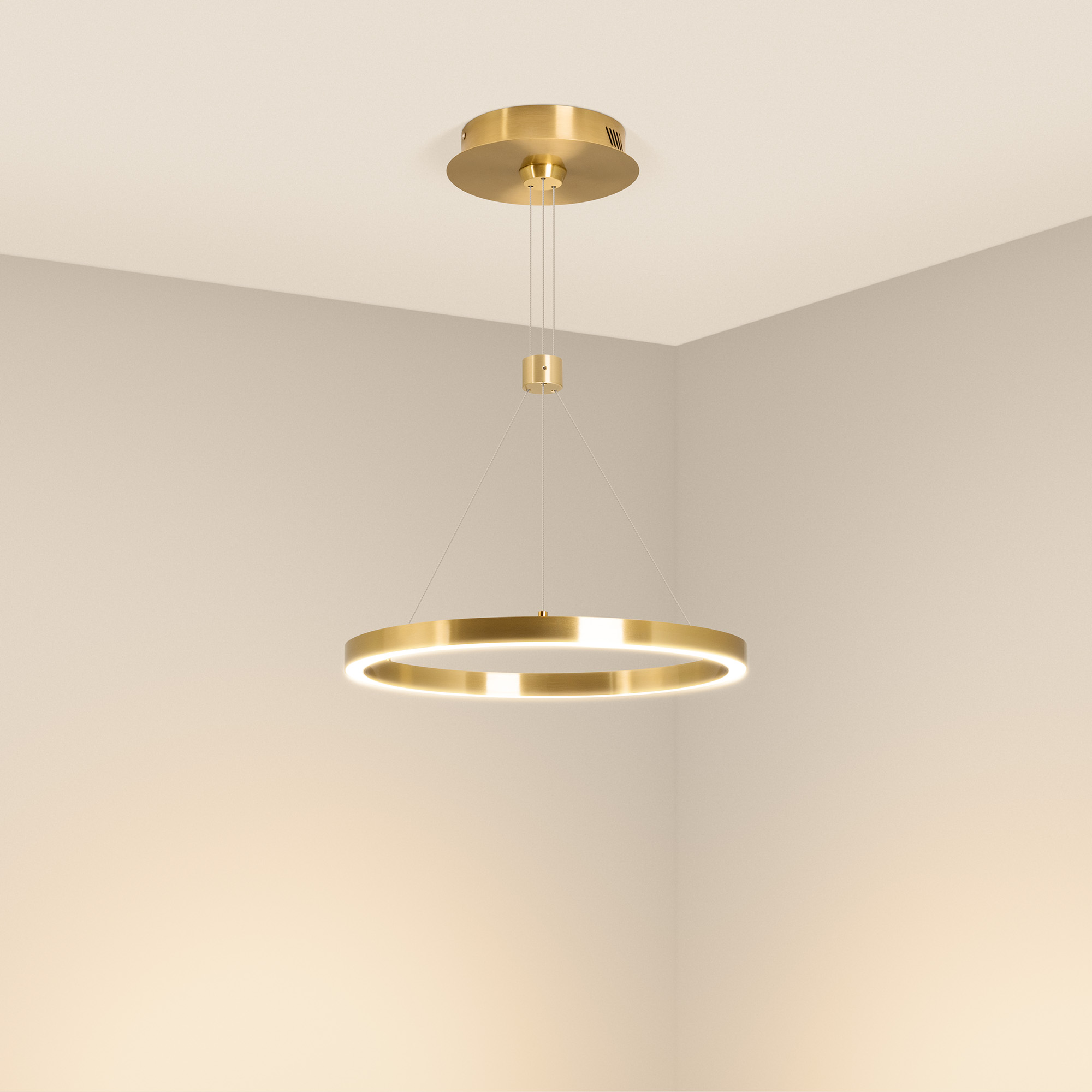 Подвесной светильник. Мощность 24 Вт, св. поток 1340 лм, 56 лм/Вт, тёплый 3000 K, CRI>90, угол 120°, напряжение питания 230 В. Золотистый круглый корпус из алюминия, экран силикон, степень защиты IP20. Размер: диаметр 400 мм, высота 25 мм, ширина профиля 25 мм, размер чаши: диаметр 170 мм, высота 40 мм. Монтаж подвесной, длина подвеса 1200мм. Драйвер 33-40 В, 600 мА. Пульсация <5%.