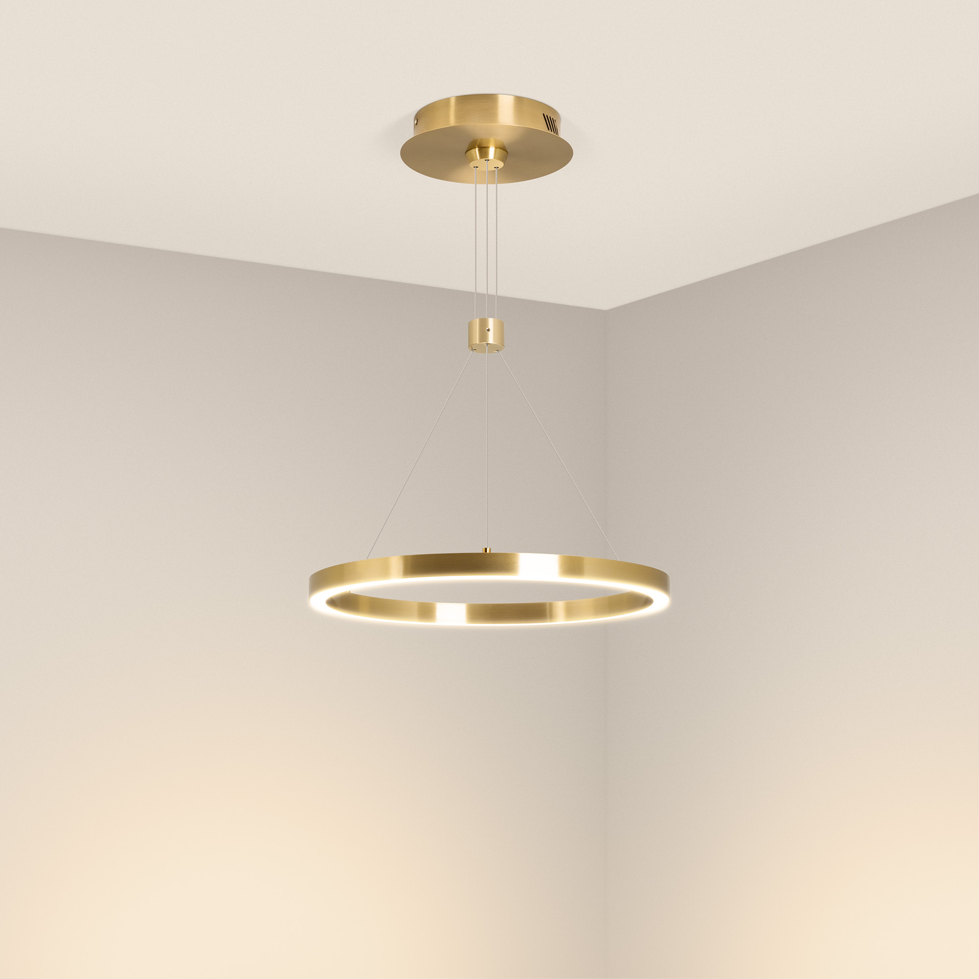 Подвесной светильник. Мощность 24 Вт, св. поток 1380 лм, 58 лм/Вт, дневной 4000 K, CRI>90, угол 120°, напряжение питания 230 В. Золотистый круглый корпус из алюминия, экран силикон, степень защиты IP20. Размер: диаметр 400 мм, высота 25 мм, ширина профиля 25 мм, размер чаши: диаметр 170 мм, высота 40 мм. Монтаж подвесной, длина подвеса 1200мм. Драйвер 33-40 В, 600 мА Пульсация <5%.