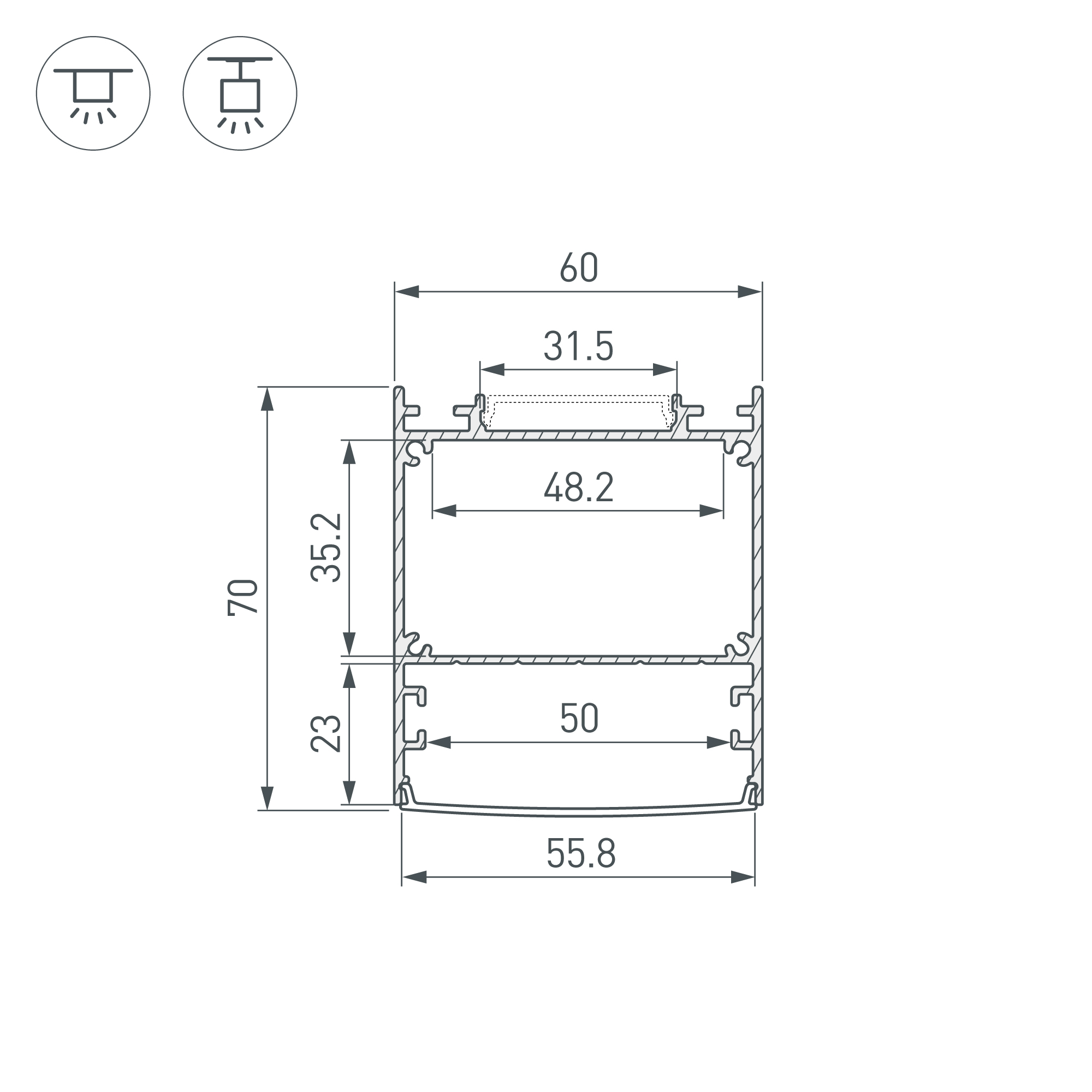 Подвесной профиль из анодированного алюминия с отсеком для блока питания (48,2х35,2 мм) с двусторонним свечением для создания эффекта «отраженного света» идеально подходит для основного освещения помещений. Габаритные размеры профиля составляют 2000 мм в длину, 60 мм в ширину и 70 мм в высоту. Площадки для установки светодиодных лент позволяют использовать ленты шириной до 50 мм и 31,5 мм (отраженный свет) и общей мощностью до 67 Вт/м. Это обеспечивает гибкость в выборе светодиодных лент и создает потрясающие световые решения. Экраны, заглушки и другие аксессуары не включены в комплект и приобретаются отдельно. Цена указана за 1 метр профиля. Отличное решение для создания современных световых проектов.