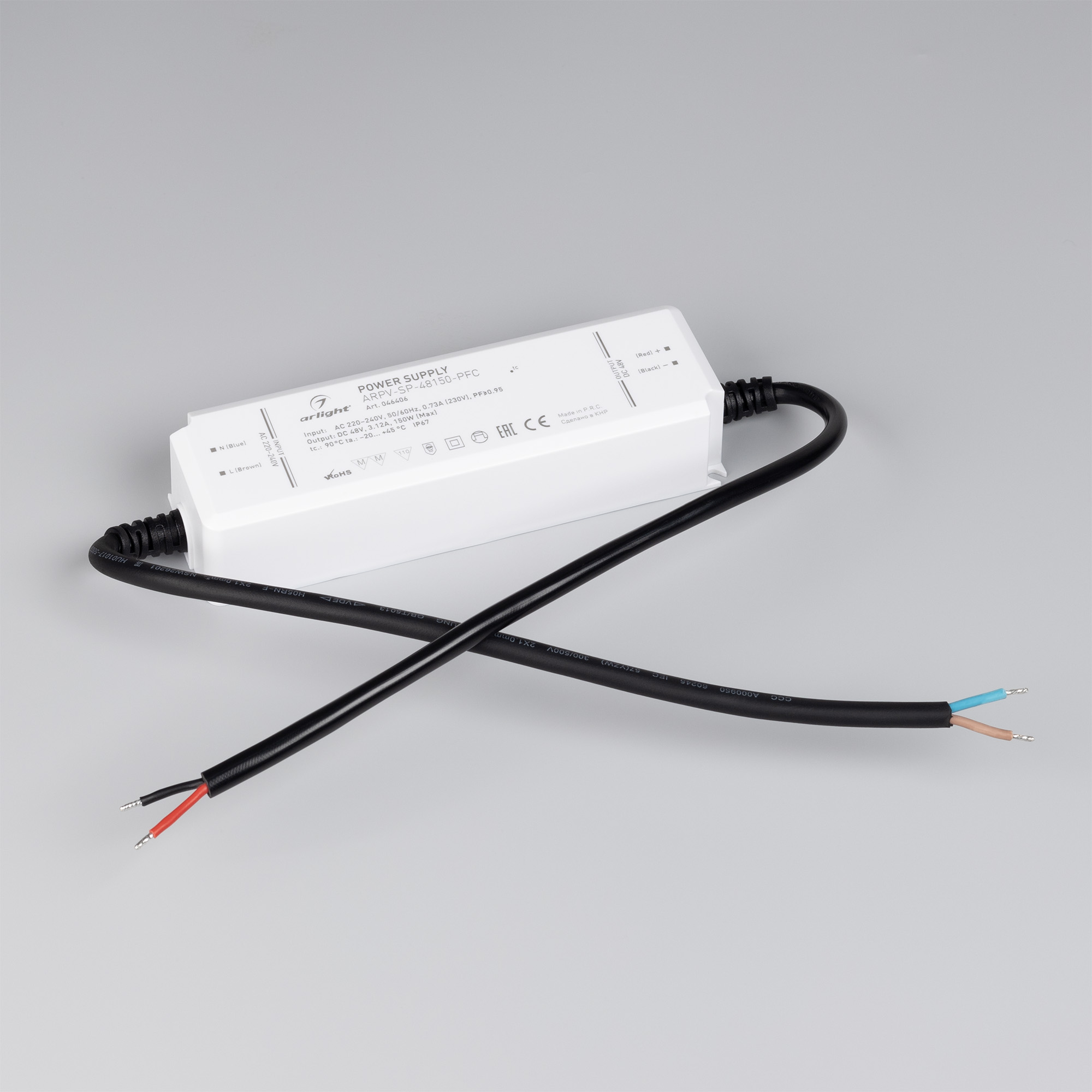 Источник напряжения с гальванической развязкой для светодиодных изделий. Входное напряжение 220-240 VAC. Выходные параметры: 48 В, 3,12 А, 150Вт. Встроенный PFC >0.95. Герметичный пластиковый корпус IP 67. Рабочая температура -20…+45C⁰. Габаритные размеры длина 156 мм, ширина 48 мм, высота 33 мм. Гарантийный срок 5 лет.