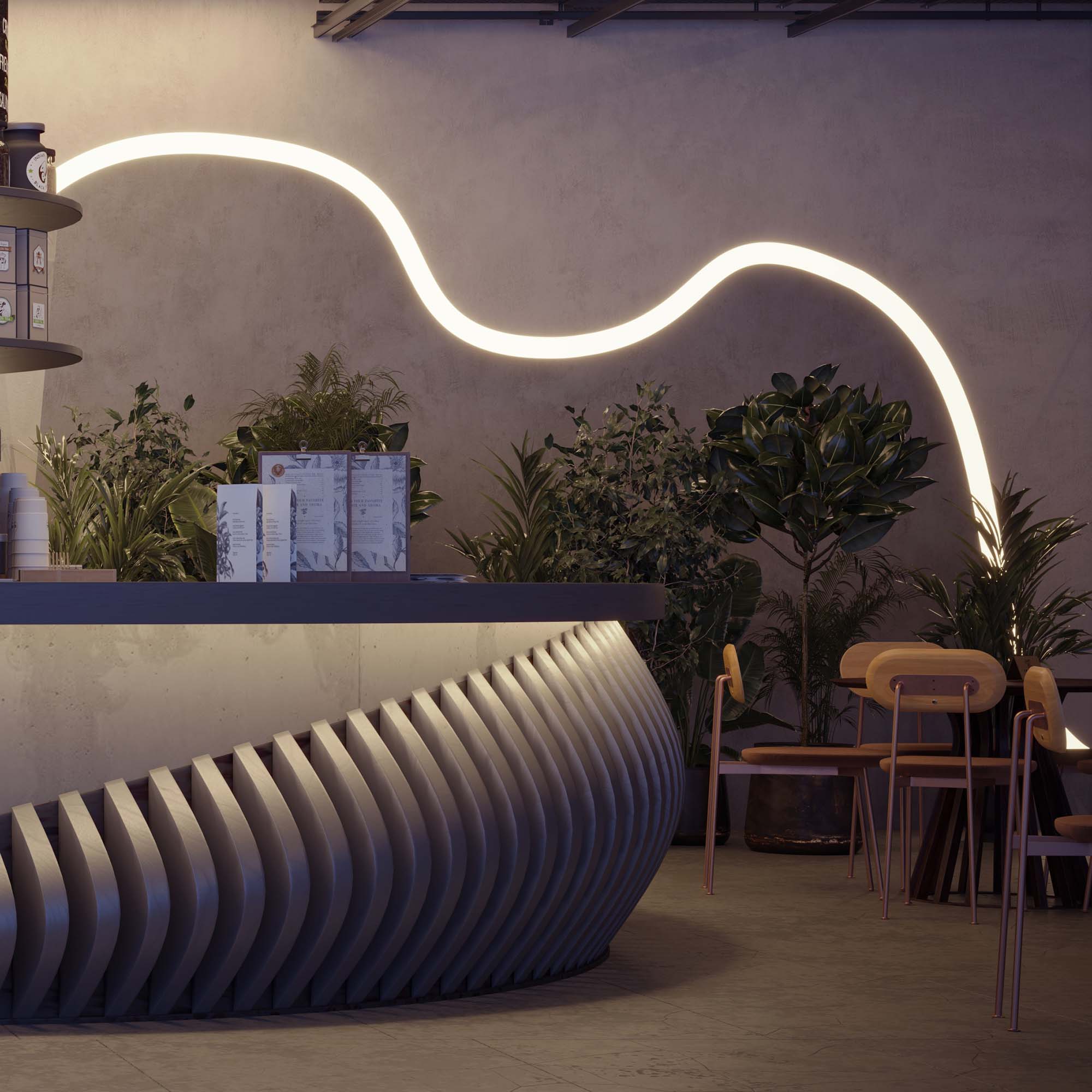 Совместим с прямым алюминиевым профилем FANTOM-W49 и гибким FANTOM-BENT-W49-TOP. Сочетание разных видов профиля поможет подчеркнуть как прямые, так и изогнутые контуры интерьера, а также создать круги и волнообразные линии, переходящие с потолка на стены.