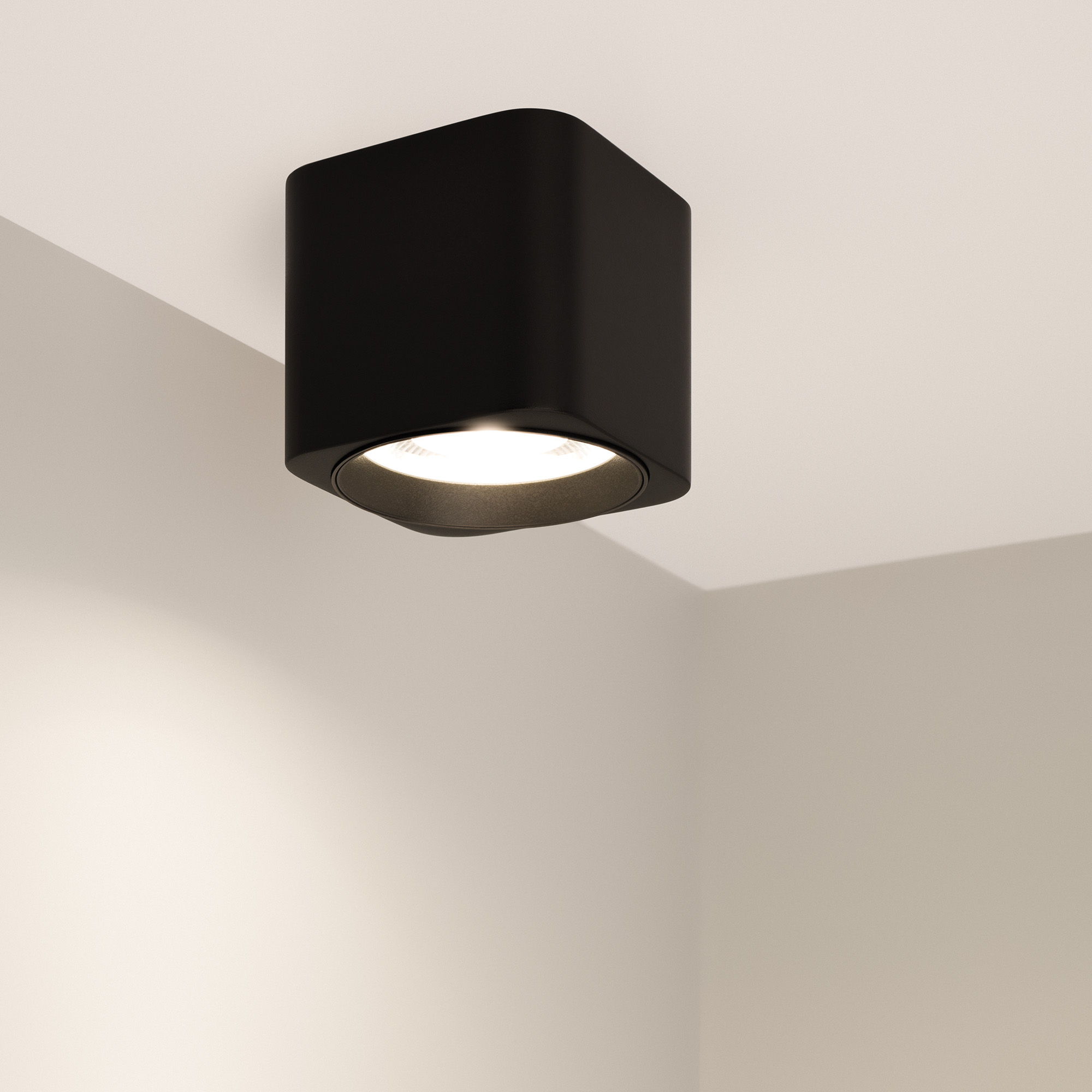 Поставка под заказ от 100 шт Накладной интерьерный светильник. Мощность 10 Вт, св. поток 780 лм, 78 лм/Вт, дневной 4000 K, CRI>90, угол 24°, напряжение питания 230 В. Черный квадратный корпус из алюминия, степень защиты IP54. Размер: длина 78 мм, ширина 78 мм, высота 65 мм. Монтаж накладной. Драйвер встроенный, пульсация <5%.