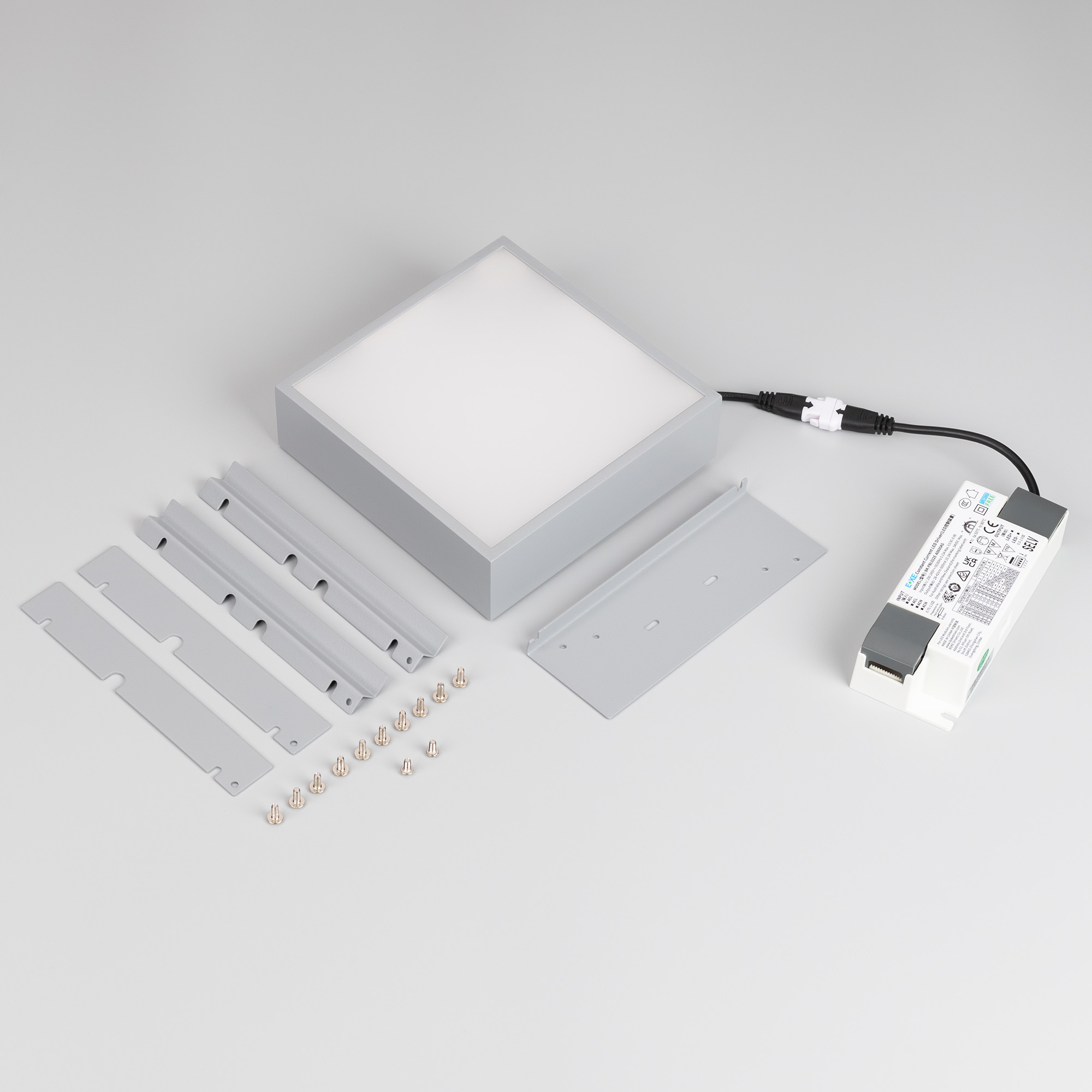 Встраиваемый светильник даунлайт для установки в потолки Грильято с размером ячейки 150х150 мм и высотой направляющих 30, 40 или 50 мм. Мощность 18 Вт, св. поток 1664 лм, 94 лм/Вт, дневной 4000 K, CRI>90, угол 100°, напряжение питания 230 В. Серый квадратный корпус из алюминия (RAL 7045), степень защиты IP40. Размер: длина 140 мм, ширина 140 мм, высота 40 мм. Монтаж встраиваемый, установочное отверстие: длина 140 мм, ширина 140 мм. Драйвер 24-42 В, 450 мА, пульсация <1%.