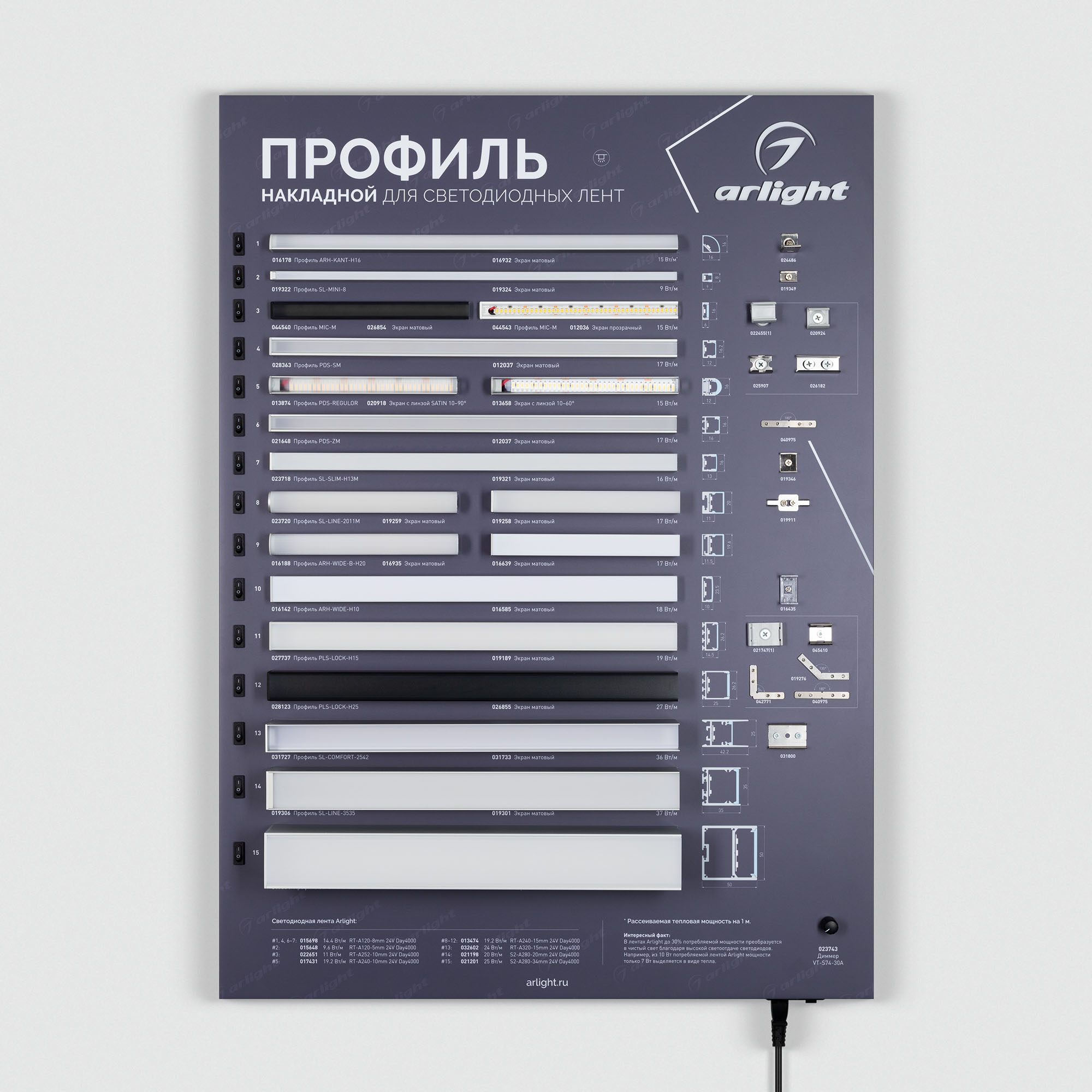 На стенде представлен ассортимент алюминиевых накладных профилей для светодиодных лент для основного и декоративного освещения.