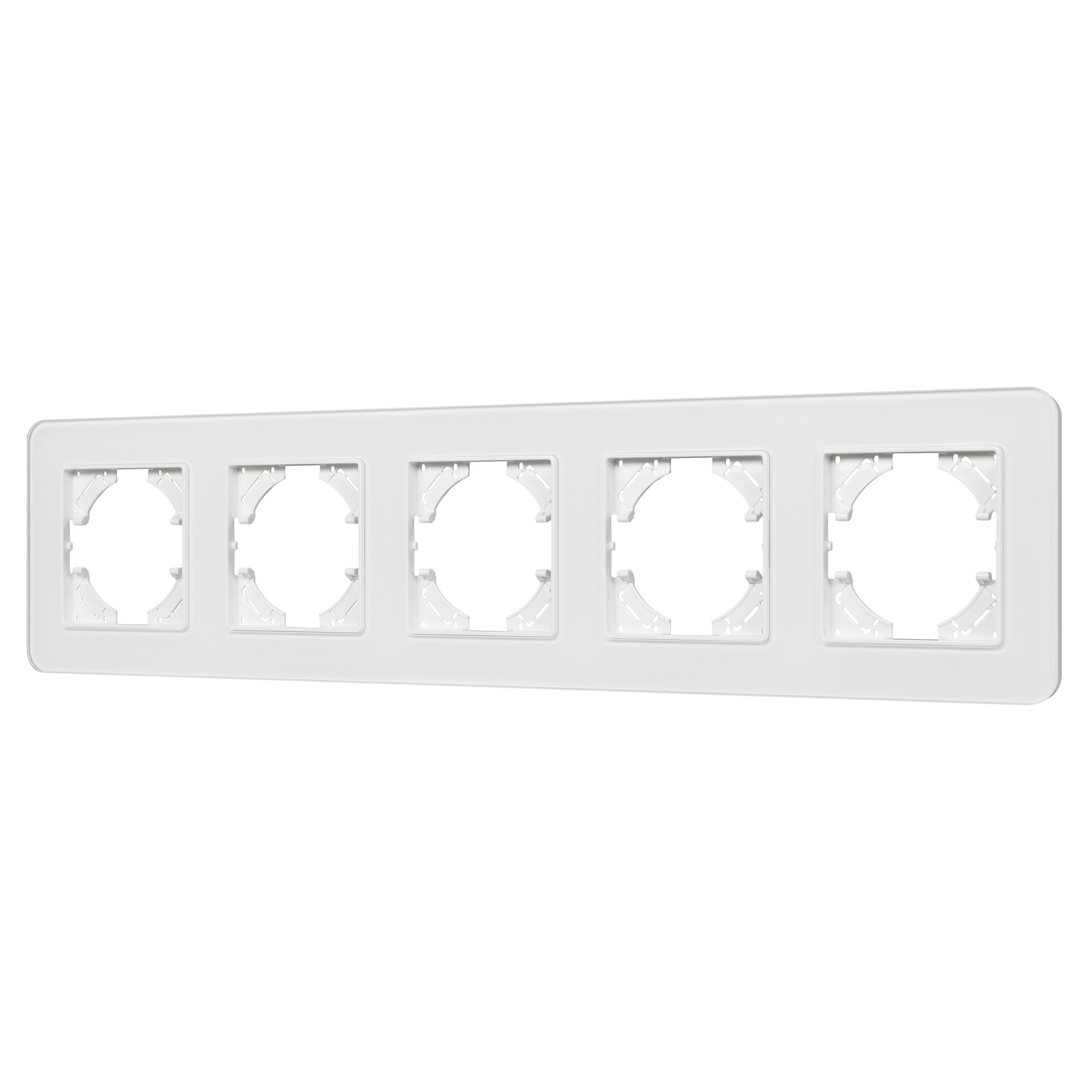 Рамка стеклянная на 5 постов, под встраиваемый механизм. Цвет - белый с Soft-Touch покрытием. Уровень герметичности IP20. Ориентация монтажа - горизонтальная (основным ориентиром служат посадочные выступы для накладки механизма). Габаритные размеры: длина 370 мм, ширина 86 мм, высота 7 мм. Гарантийный срок 12 мес.