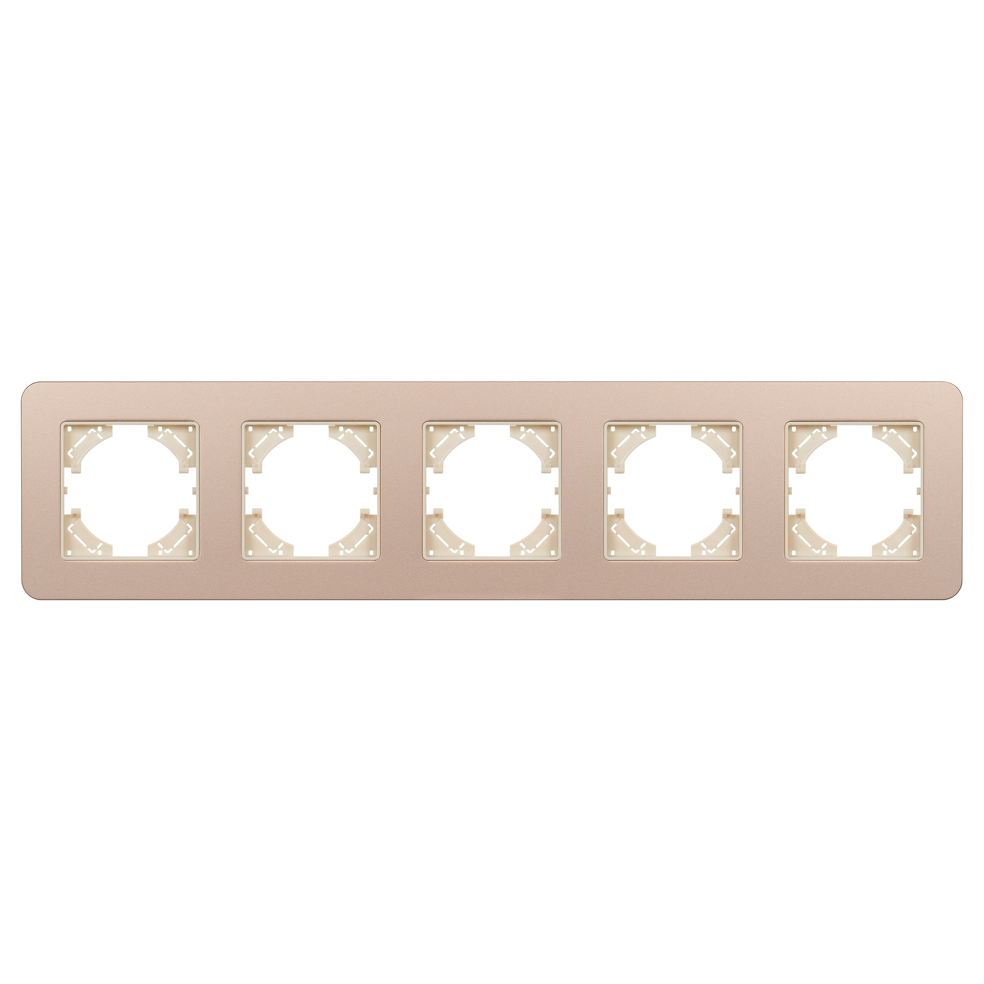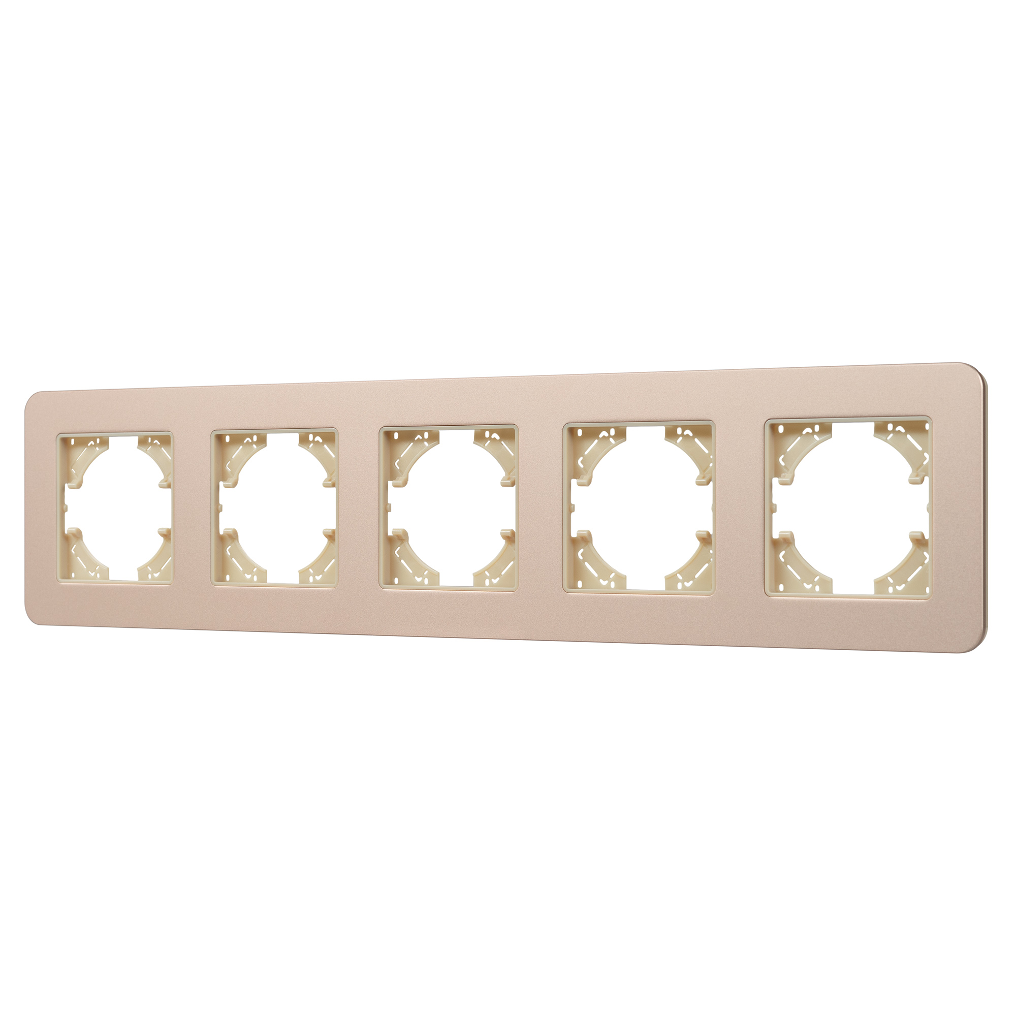 Рамка алюминиевая на 5 постов, под встраиваемый механизм. Цвет - золотой с Soft-Touch покрытием. Уровень герметичности IP20. Ориентация монтажа - горизонтальная (основным ориентиром служат посадочные выступы для накладки механизма). Габаритные размеры: длина 370 мм, ширина 86 мм, высота 7 мм. Гарантийный срок 12 мес.