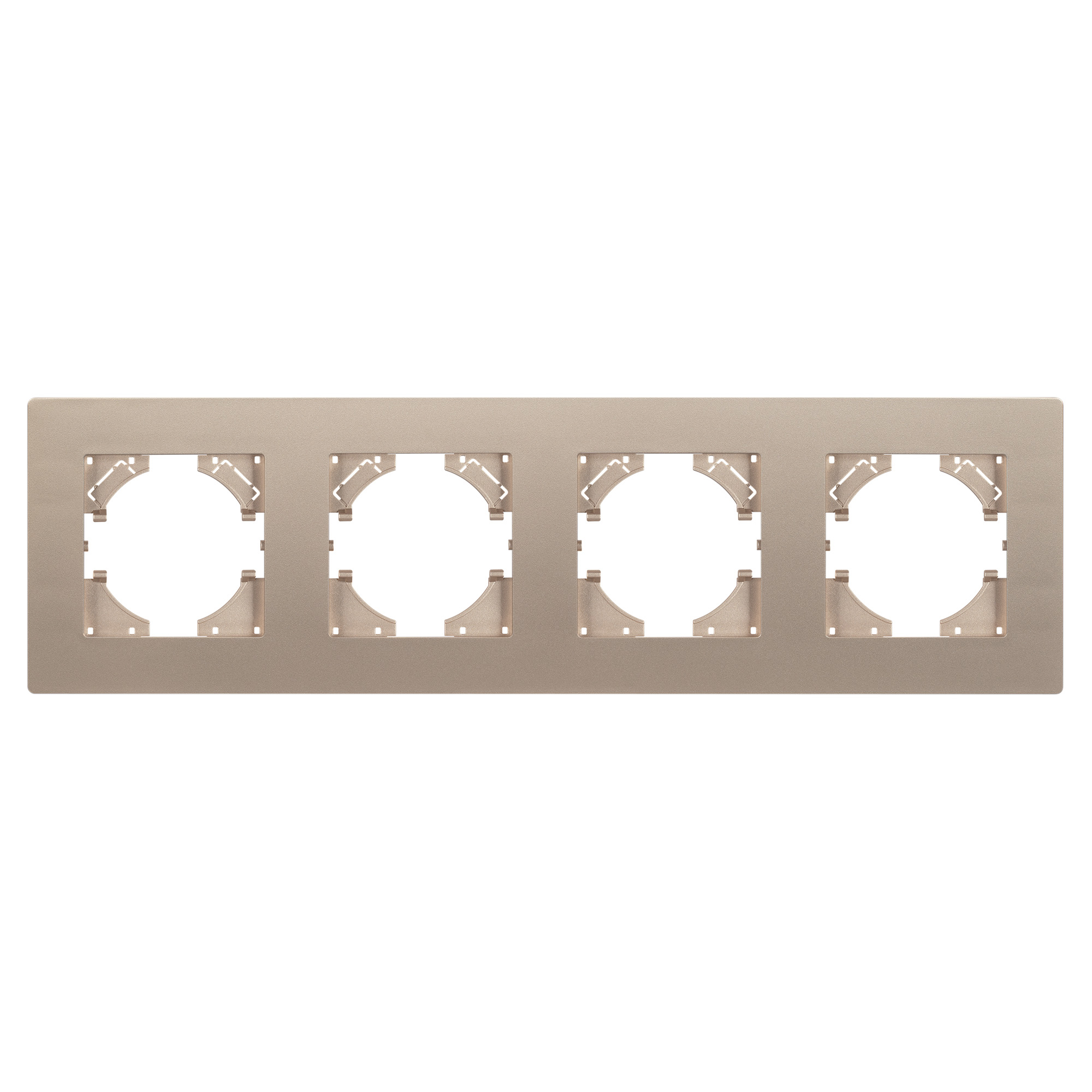 Рамка пластиковая на 4 поста, под встраиваемый механизм. Цвет - золотой. Уровень герметичности IP20. Ориентация монтажа - горизонтальная (основным ориентиром служат посадочные выступы для накладки механизма). Габаритные размеры: длина 299 мм, ширина 86 мм, высота 7 мм. Гарантийный срок 12 мес.