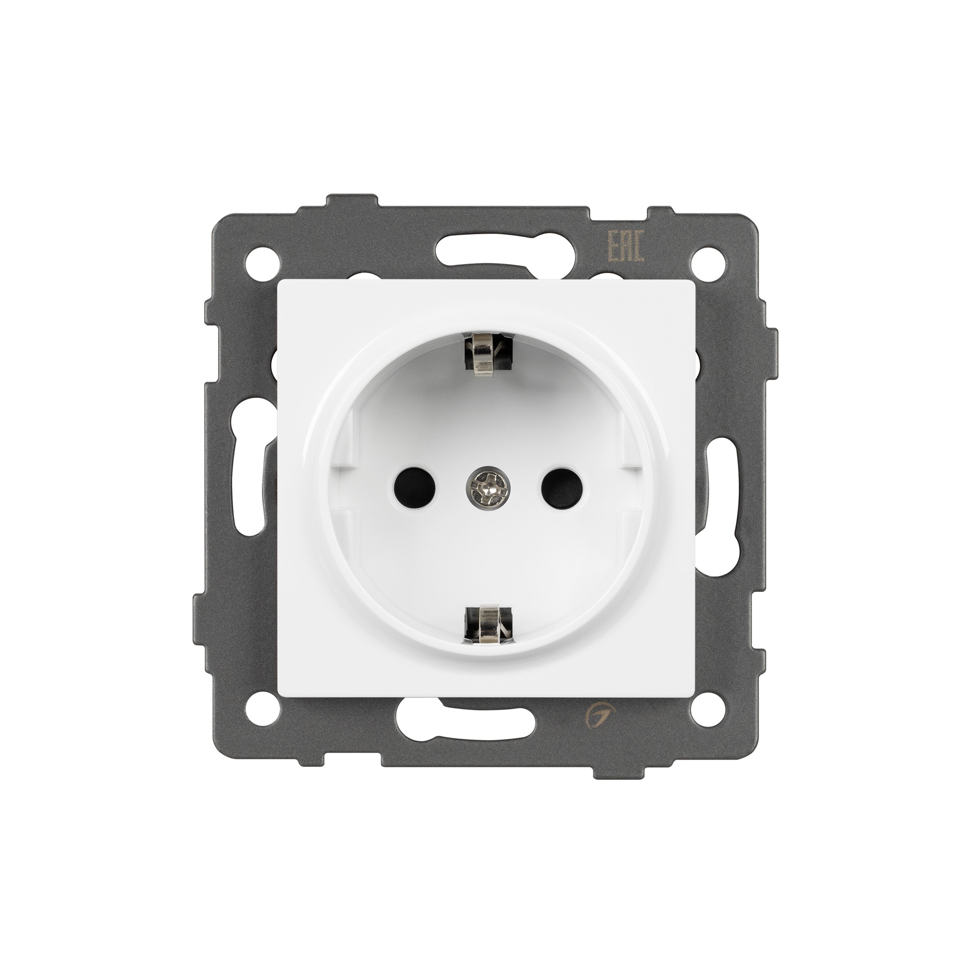 Механизм розетки с заземлением на 1 пост. Цвет - белый. Без фронтальной рамки. Уровень пылевлагозащиты IP20. Устанавливается в стандартный подрозетник.
