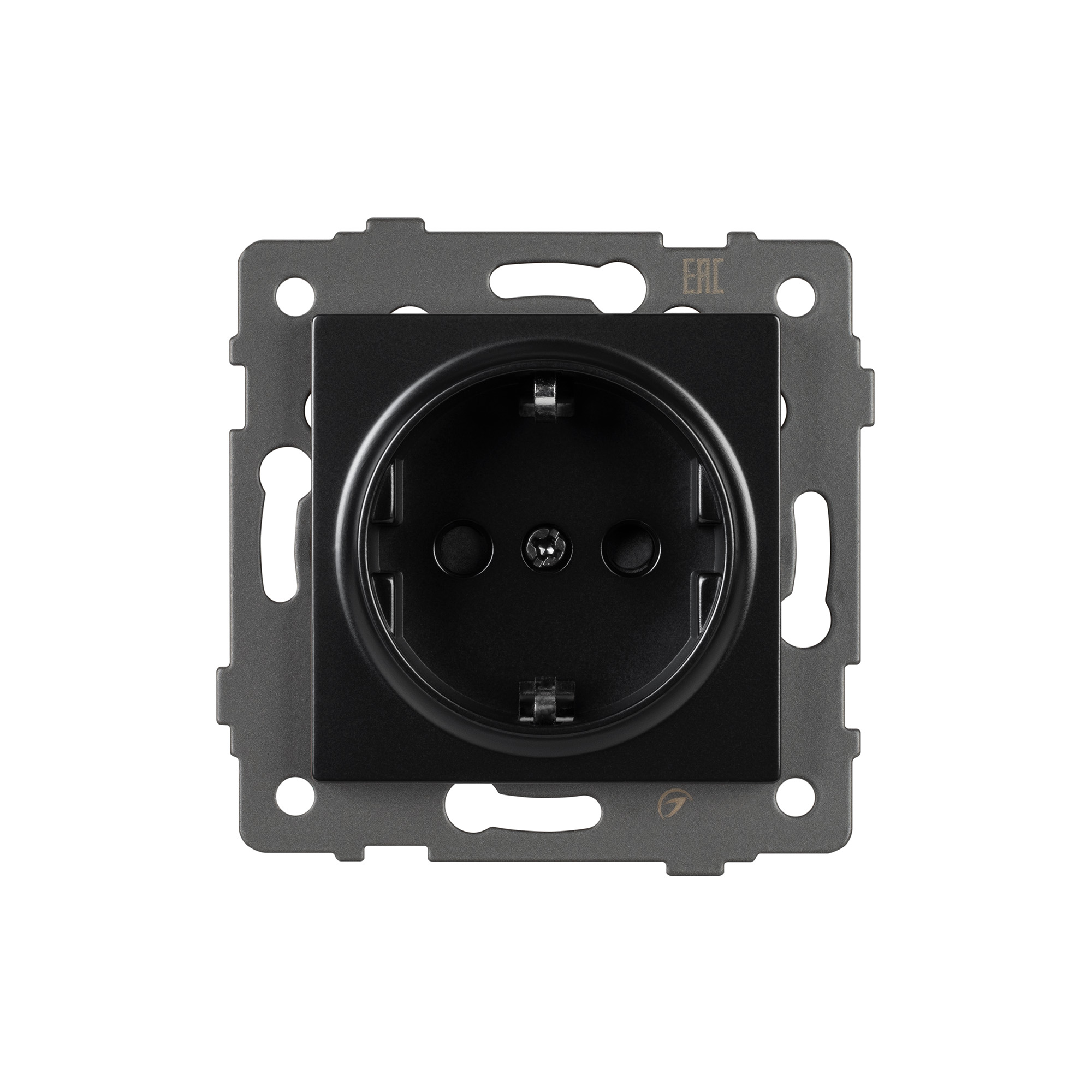 Механизм розетки с заземлением на 1 пост. Цвет - черный. Без фронтальной рамки. Уровень пылевлагозащиты IP20. Устанавливается в стандартный подрозетник.