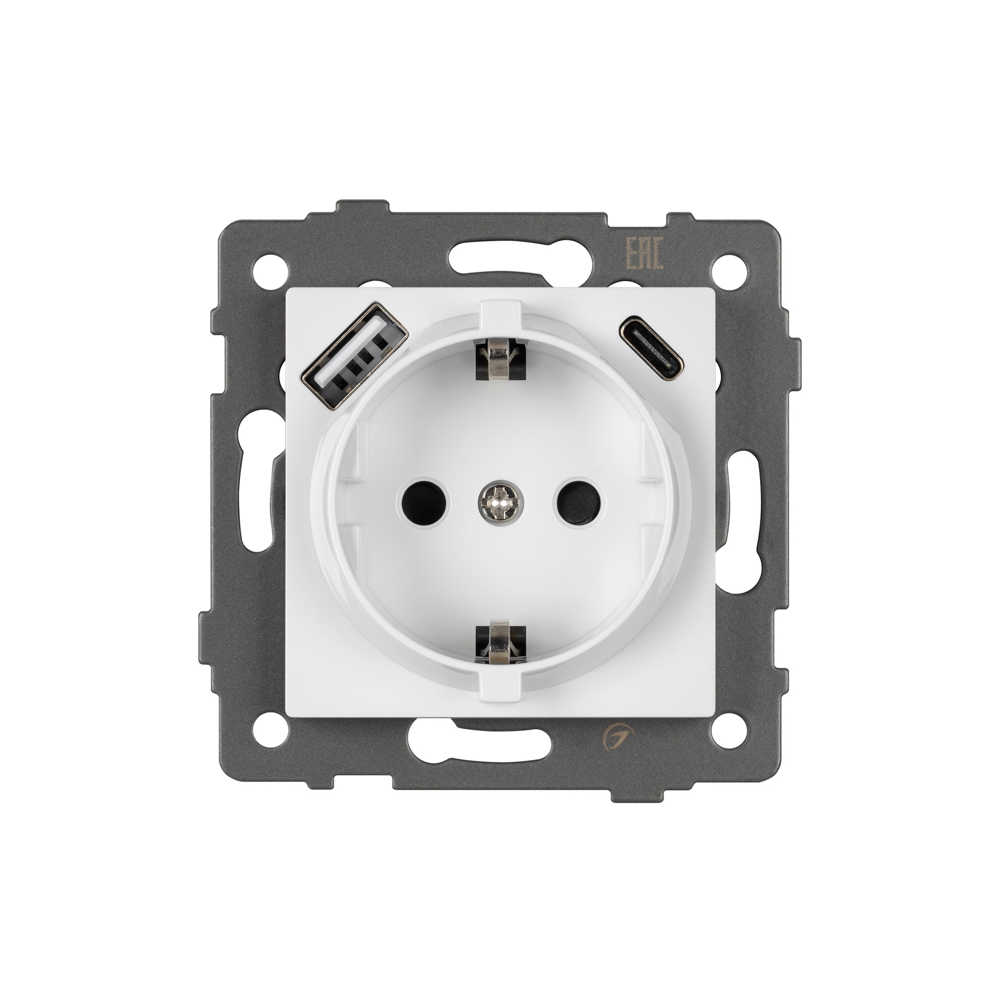 Механизм розетки с заземлением 1 пост 2 USB Type A+C порта. Цвет - белый. Без фронтальной рамки. Уровень пылевлагозащиты IP20. Устанавливается в стандартный подрозетник. Габаритные размеры: длина 71 мм, ширина 71 мм, высота 53 мм. Гарантийный срок 10 лет.