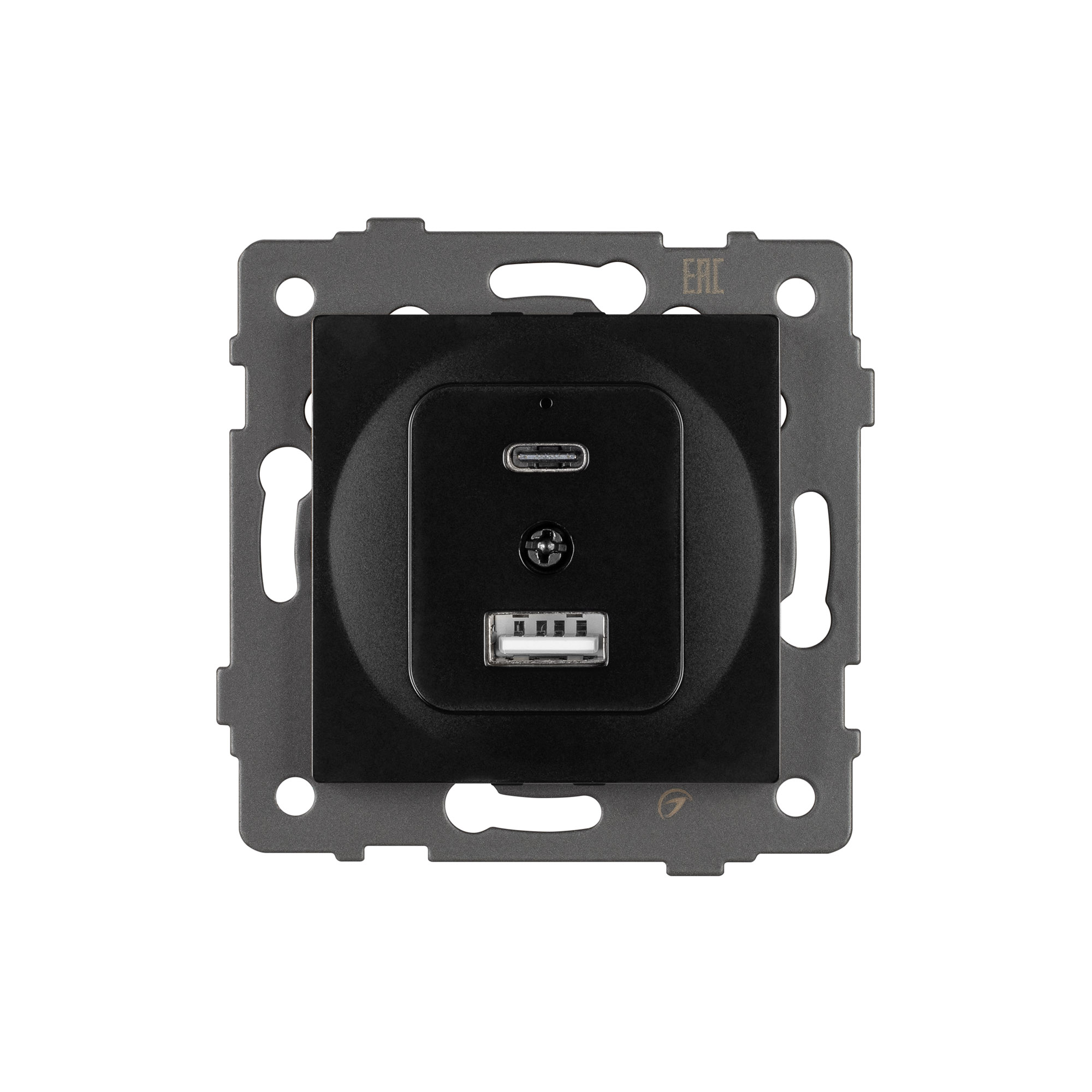 Механизм розетки с заземлением на 2 USB type A+C порта. Цвет - черный. Без фронтальной рамки. Уровень пылевлагозащиты IP20. Устанавливается в стандартный подрозетник.