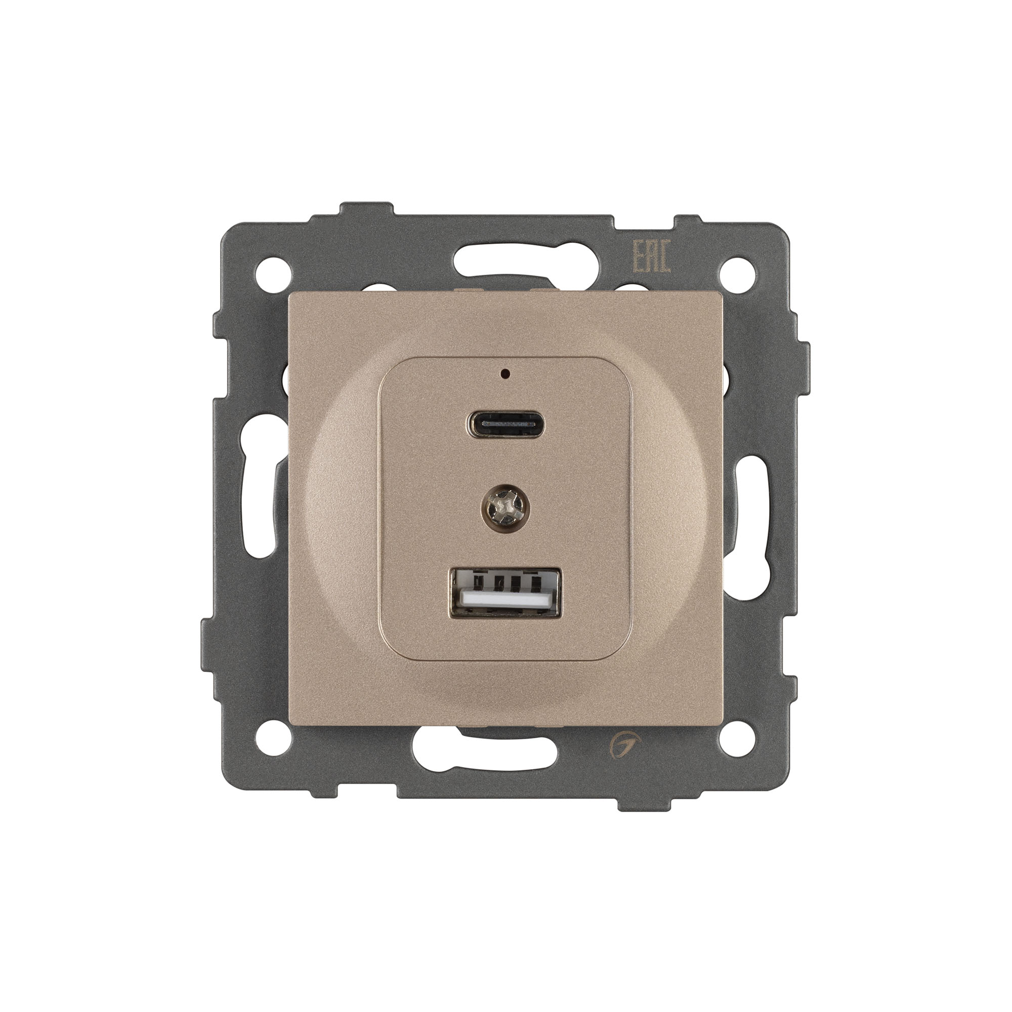 Механизм розетки с заземлением на 2 USB type A+C порта. Цвет - золотой. Без фронтальной рамки. Уровень пылевлагозащиты IP20. Устанавливается в стандартный подрозетник. Габаритные размеры: длина 71 мм, ширина 71 мм, высота 42 мм. Гарантийный срок 10 лет.