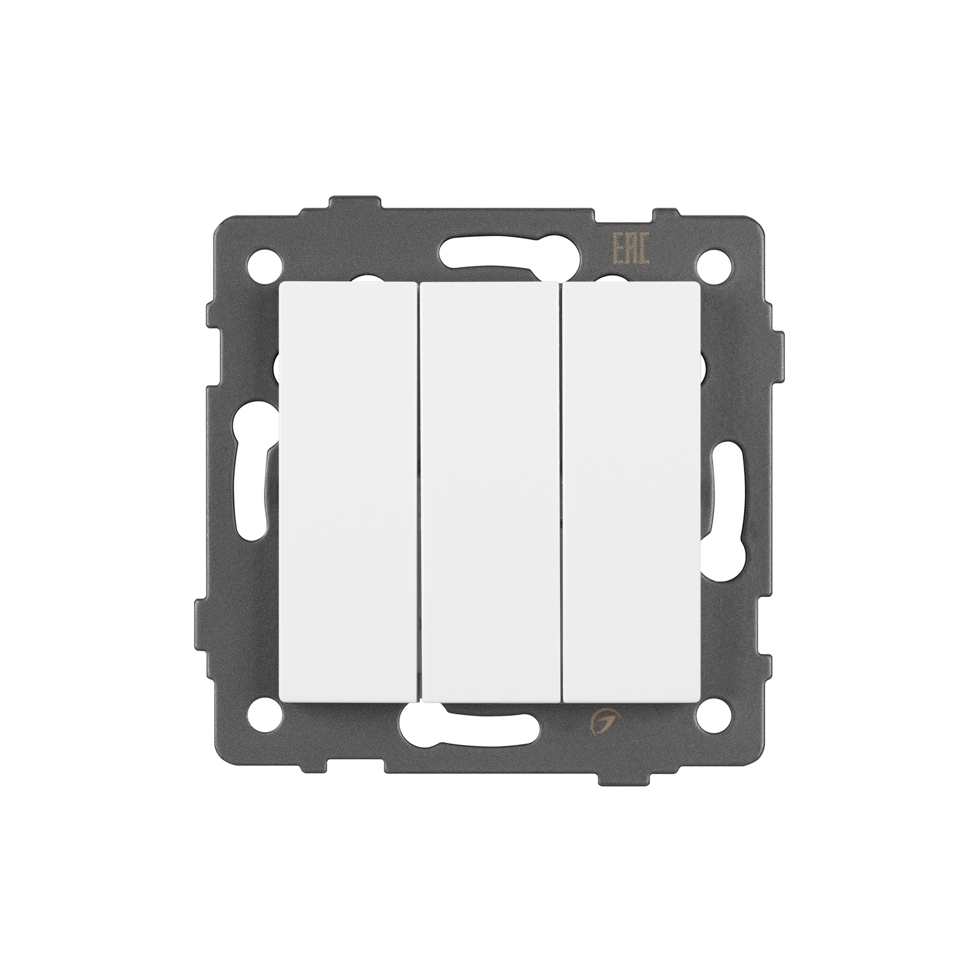 Механизм выключателя света клавишный на 1 пост 3 клавиши (непроходной). Цвет - белый. Без фронтальной рамки. Уровень пылевлагозащиты IP20. Выключатель устанавливается в стандартный круглый подрозетник. Габаритные размеры: длина 71 мм, ширина 71 мм, высота 52 мм. Гарантийный срок 10 лет.