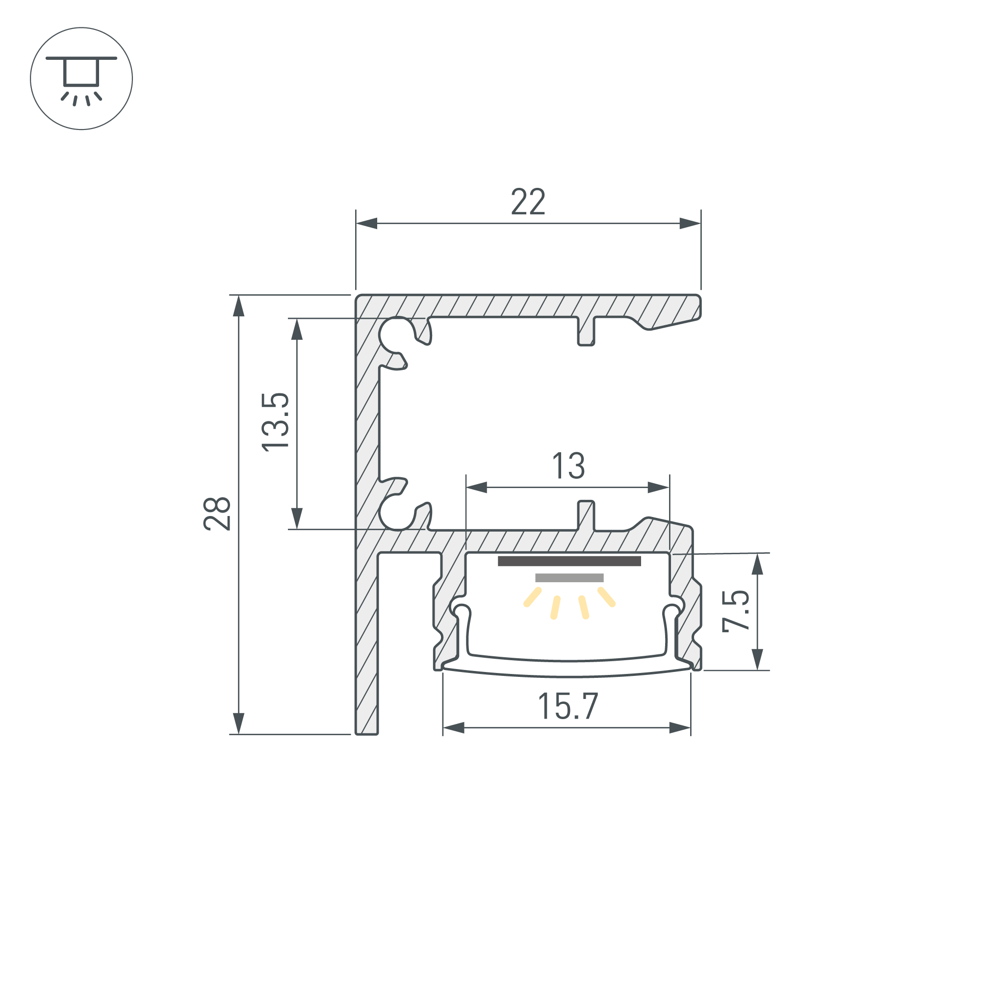 Габаритные размеры профиля составляют 2000 мм в длину, 22 мм в ширину и 28 мм в высоту. Площадки для установки светодиодных лент позволяют использовать ленты шириной до 13 мм и мощностью до 31 Вт/м. Это обеспечивает гибкость в выборе светодиодных лент и создает потрясающие световые решения.