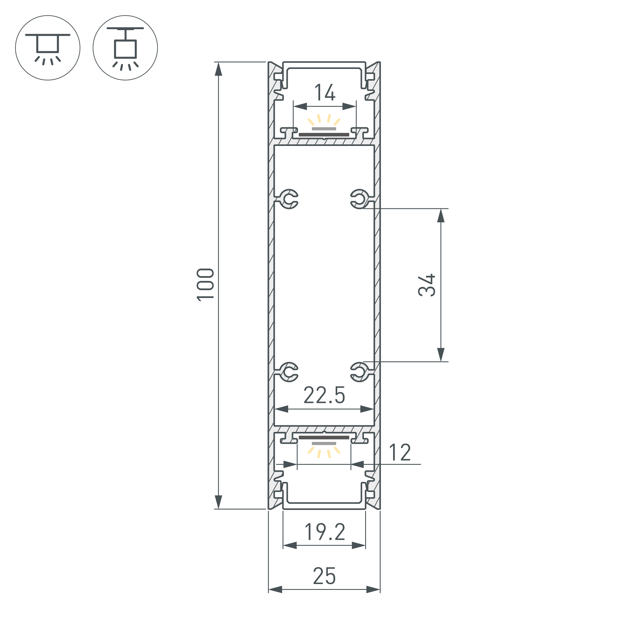 Габаритные размеры профиля составляют 2500 мм в длину, 25 мм в ширину и 100 мм в высоту. Площадки для установки светодиодных лент позволяют использовать ленты шириной до 12 мм и мощностью до 33 Вт/м каждая. Это обеспечивает гибкость в выборе светодиодных лент и создает потрясающие световые решения.