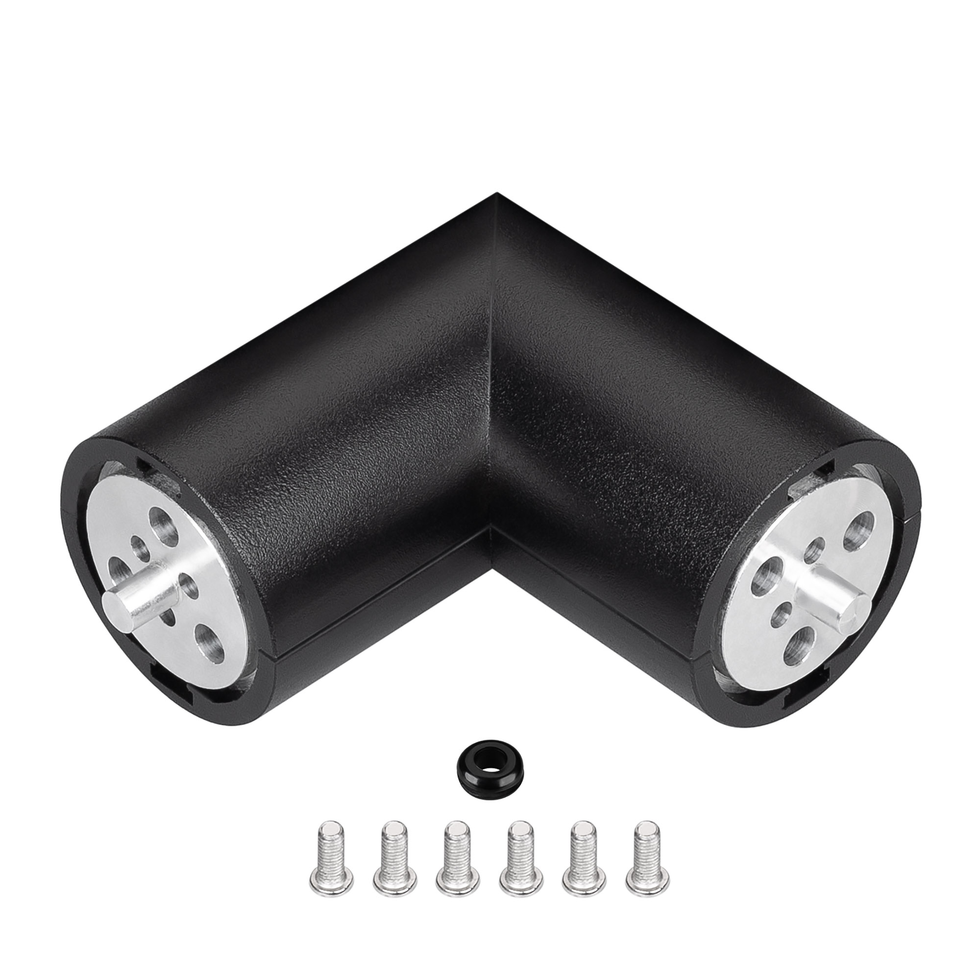 Угловой коннектор для соединения двух отрезков профиля ROUND-D36-360 под углом 90° с отверстием для вывода кабеля питания. В комплекте: соединитель угловой - 1 шт., втулка - 2 шт., винт длинный - 2 шт., винт короткий - 6 шт., гермоввод - 1 шт. Цена за комплект.