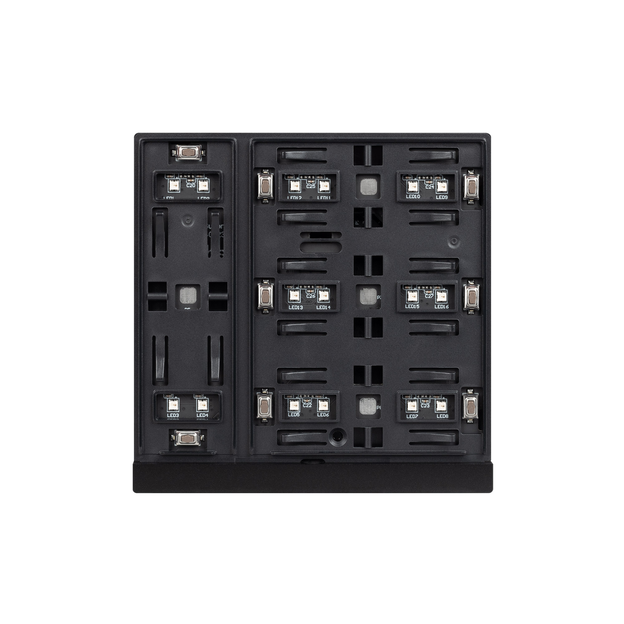 Механизм встраиваемой панели черного цвета с кнопочным управлением, предназначенная для включения и выключения световых сцен в системах управления светом KNX. Позволяет осуществлять включение/выключение, диммирование, управление шторами и жалюзи, управлять сценами. Поддерживает управление с помощью 4 настраиваемых рокерных клавиш. Каждая клавиша может выполнять функции 2-х клавиш. Устройство совместимо с исполнительными устройствами стандарта KNX, в том числе, мировых производителей ABB, SCHNEIDER ELECTRIC, SIEMENS, ZENNIO и другими. Удобное и точное управление при помощи отдельных механических кнопок для каждой функции. Питание от шины KNX. Габариты устройства составляют 86x86x33 мм, установка в стандартную монтажную коробку. Пластиковый корпус, цвет черый, безрамочный корпус, материал - пластик, светодиодная индикация.