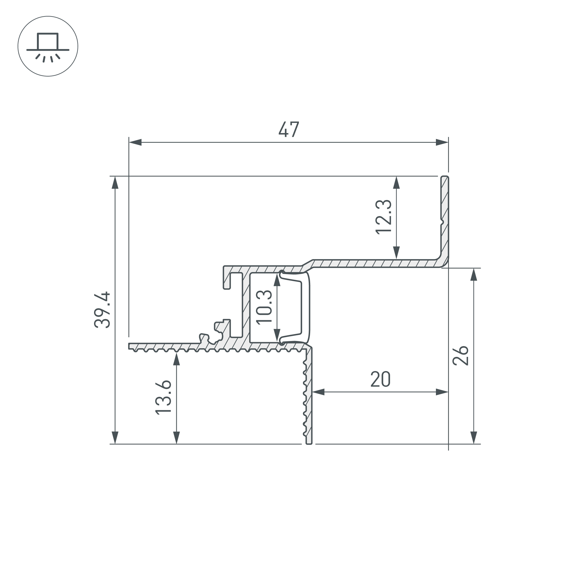 Алюминиевый анодированный встраиваемый профиль для светодиодных лент и линеек. Профиль для создания эффекта парящего потолка с мягким свечением по периметру помещения. Цвет - черный. Габаритные размеры (L×W×H): 3000х47х39,4 мм. Ширина площадки для ленты 10,3 мм. Ширина зазор между потолком и стеной - 20 мм. Экраны, заглушки и другие аксессуары приобретаются отдельно. Цена за 1 метр.