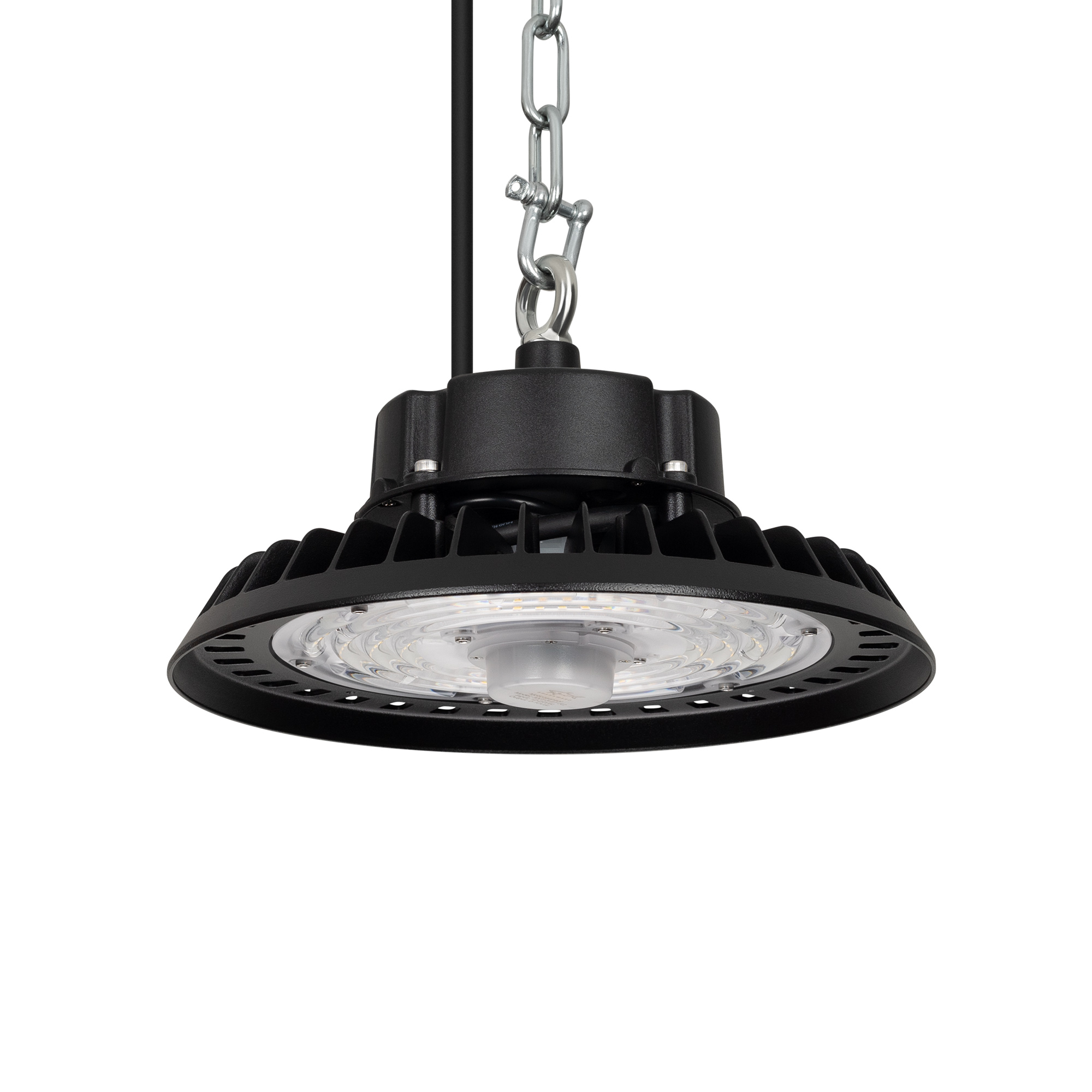 Светильник для освещения складских и промышленных помещений. Мощность 100W, напряжение питания AC 120-270V/50Hz. CRI 80. Тип светодиодов SMD2835, с групповой оптической линзой. Цвет свечения ДНЕВНОЙ 5000K, световой поток 15000 Lm, угол рассеивания 60°. Доступно управление по протоколу 0-10В. Цвет корпуса черный, линза из поликарбоната, степень влагозащиты IP65 ударопрочность IK08. Габариты Ф260xH140мм. Рым-болт в комплекте. Датчик настраивается с помощью пульта 052018 (один на все датчики). Длина кабеля питания 900 мм.