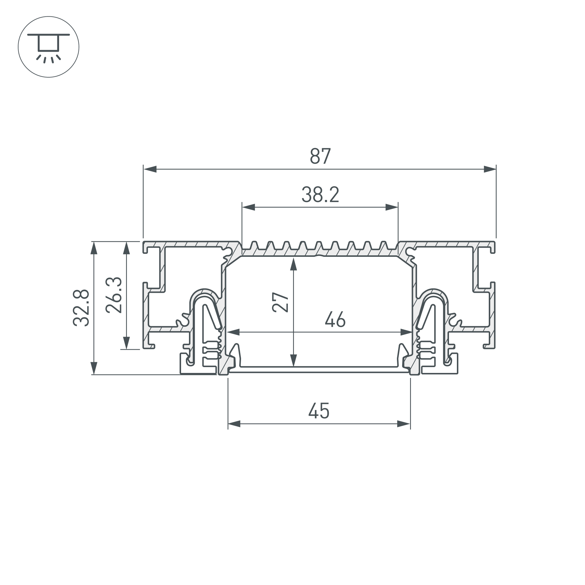Габаритные размеры профиля составляют 2000 мм в длину, 86,8 мм в ширину и 32,7 мм в высоту. Площадка для установки светодиодных лент позволяет использовать ленту шириной до 38 мм и мощностью до 62 Вт/м. Это обеспечивает гибкость в выборе светодиодных лент и создает потрясающие световые решения.