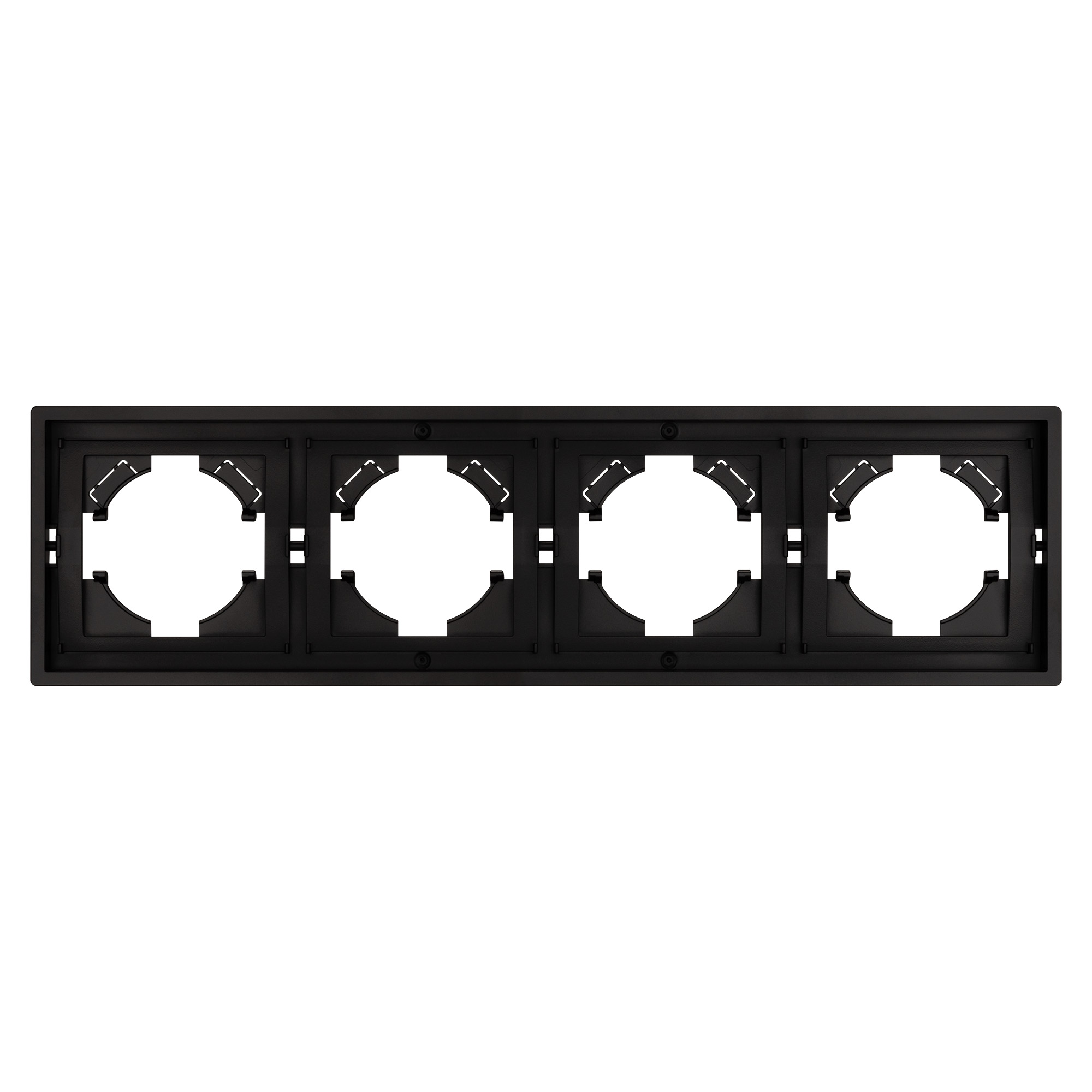 Рамка пластиковая на 4 поста, под встраиваемый механизм. Цвет - черный. Уровень герметичности IP20. Ориентация монтажа горизонтальная. Габаритные размеры: длина 294 мм, ширина 80 мм, высота 9 мм. Гарантийный срок 12 мес.