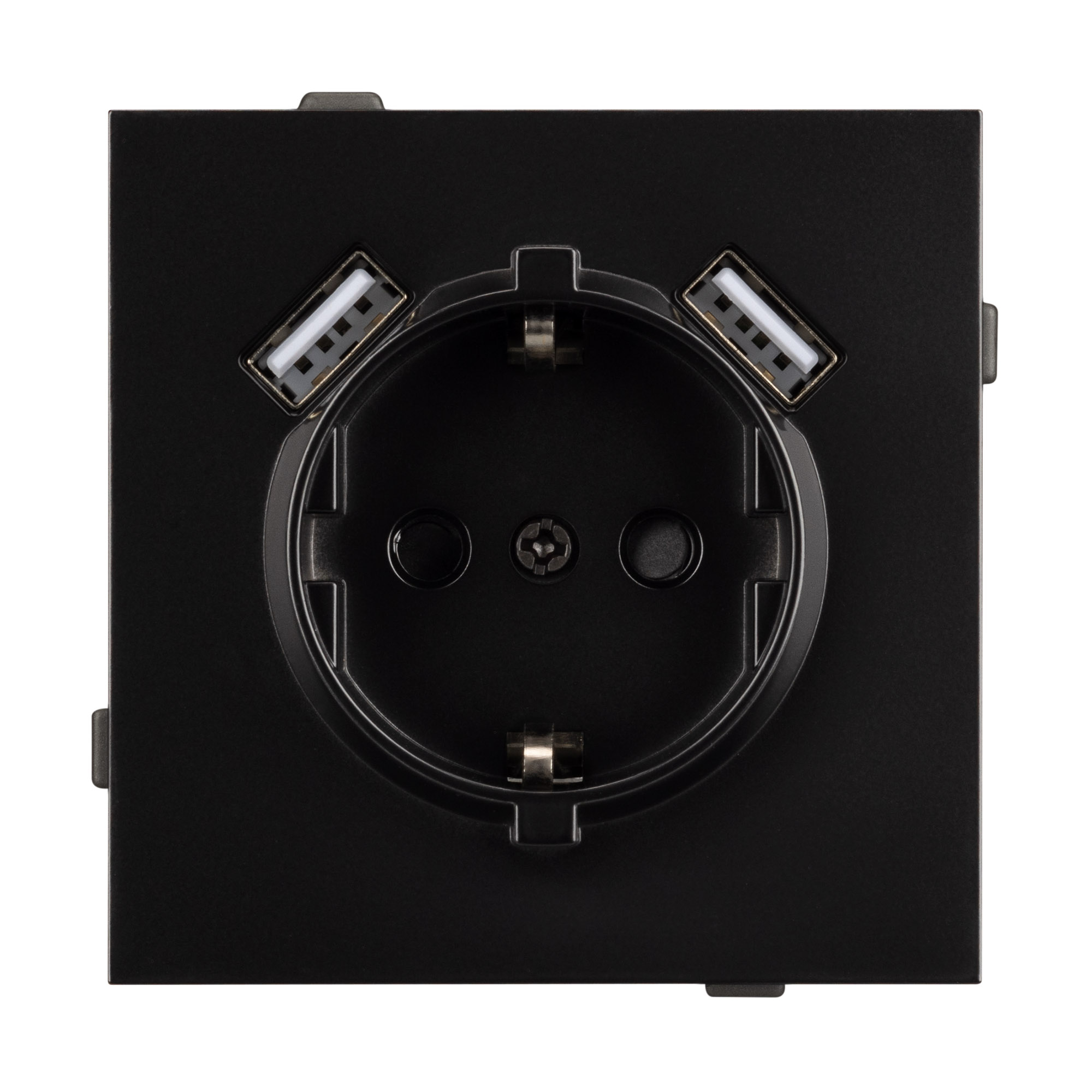 Механизм розетки с USB зарядкой, совместимый с рамками серии TENDO, создает утонченный минималистичный вид. Наличие двух USB Type A портов позволяет существенно сократить количество используемых розеточных постов под евровилку, сохраняя единую стилистику интерьера всего современного дизайн-проекта. Видимая часть механизма выполнена из высококачественного пластика черного цвета и имеет матовое покрытие, что придает изделию приятные тактильные ощущения и стильный внешний вид. Розетка оснащена заземляющими контактами и защитными шторками, обеспечивая надежное и безопасное подключение электроприборов. Контактная часть присоединяется при помощи винтовых зажимов, позволяя надежно подсоединить механизм выключателя к питающим элементам. А усиленные распорные лапки двойного захвата надежно фиксируют механизм в установочном подрозетнике круглого сечения диаметром от 60мм. На каждой стороне суппорта размещены фиксирующие элементы, позволяющие комбинировать механизмы в системы до 5шт горизонтально, под соответствующую рамку.