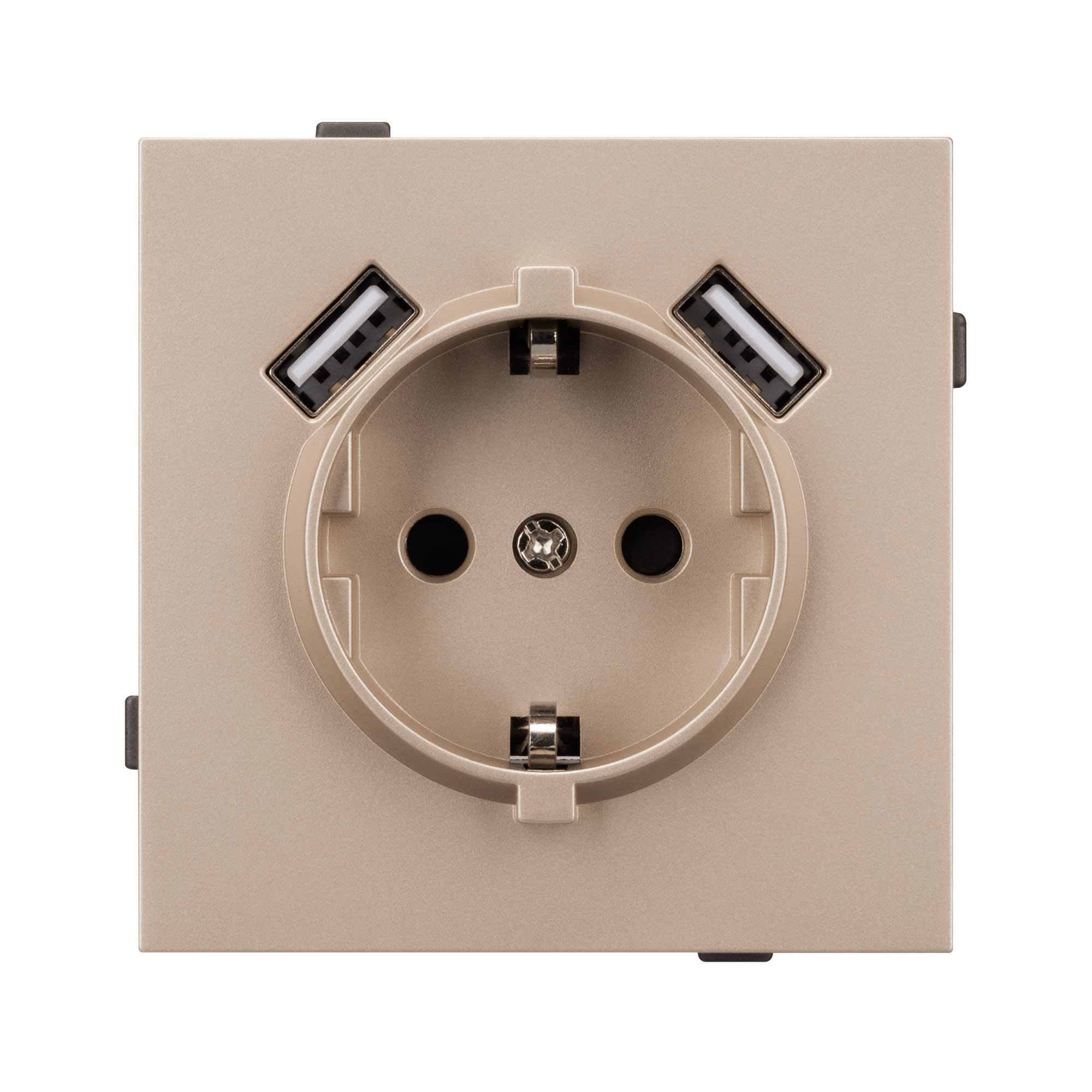 Механизм розетки с USB зарядкой, совместимый с рамками серии TENDO, создает утонченный минималистичный вид. Наличие двух USB Type A портов позволяет существенно сократить количество используемых розеточных постов под евровилку, сохраняя единую стилистику интерьера всего современного дизайн-проекта. Видимая часть механизма выполнена из высококачественного пластика золотого цвета и имеет матовое покрытие, что придает изделию приятные тактильные ощущения и стильный внешний вид. Розетка оснащена заземляющими контактами и защитными шторками, обеспечивая надежное и безопасное подключение электроприборов. Контактная часть присоединяется при помощи винтовых зажимов, позволяя надежно подсоединить механизм выключателя к питающим элементам. А усиленные распорные лапки двойного захвата надежно фиксируют механизм в установочном подрозетнике круглого сечения диаметром от 60мм. На каждой стороне суппорта размещены фиксирующие элементы, позволяющие комбинировать механизмы в системы до 5шт горизонтально, под соответствующую рамку.