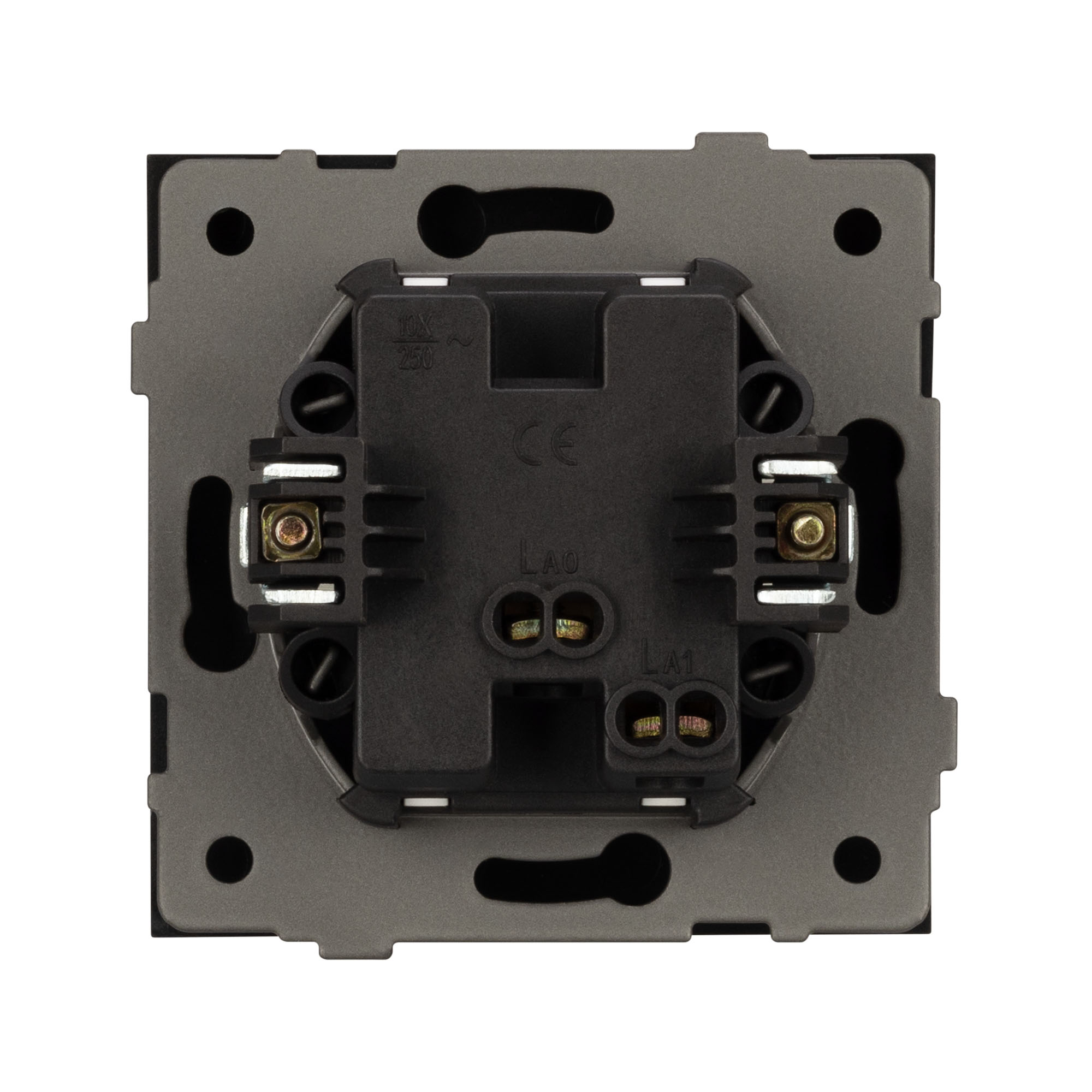 Контактная часть присоединяется при помощи винтовых зажимов, позволяя надежно подсоединить механизм выключателя к питающим элементам. А усиленные распорные лапки двойного захвата надежно фиксируют механизм в установочном подрозетнике круглого сечения диаметром 60мм.