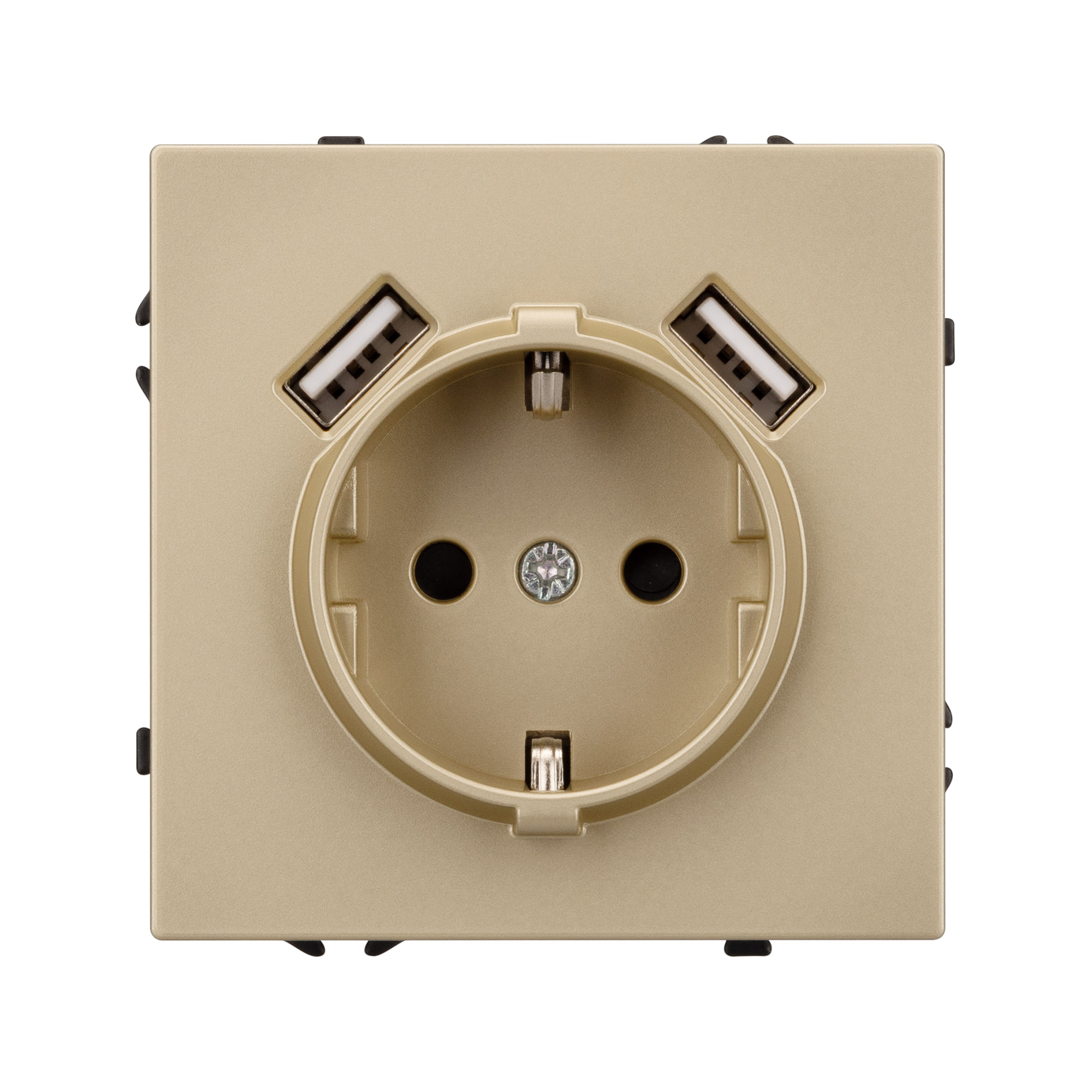 Механизм розетки с заземлением на 1 пост и 2USB Type A порта. Цвет - золотой песок, с Soft-Touch покрытием. Без фронтальной рамки. Уровень пылевлагозащиты IP20. Розетка устанавливается в стандартный подрозетник круглого сечения диаметром 60мм. Габаритные размеры: длина 71 мм, ширина 71 мм, высота 53 мм. Гарантийный срок 10 лет.